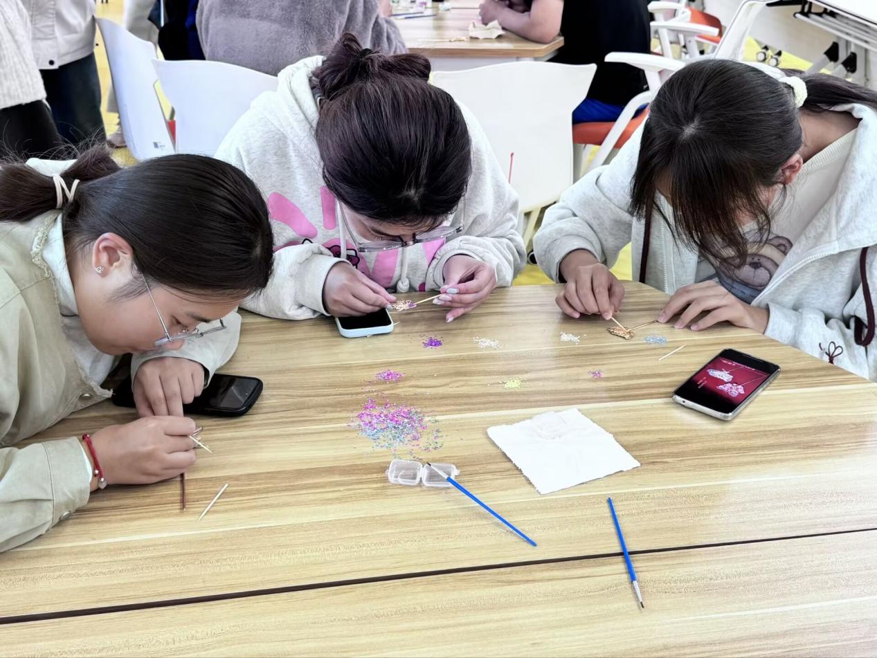 在体验环节,同学们在专业指导下,挑选心仪的贝壳片,到用细砂纸耐心打磨使其表面光滑细腻,再到根据预先设计的图案进行切割与拼贴,每一个步骤都考验着大家的细心与专注力。