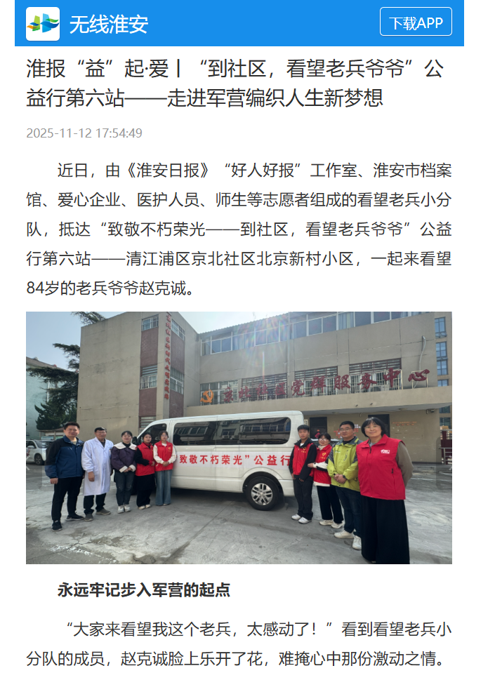 近日,由《淮安日报》“好人好报”工作室、淮安市档案馆、爱心企业、医护人员、师生等志愿者组成的看望老兵小分队,抵达“致敬不朽荣光——到社区,看望老兵爷爷”公益行第六站——清江浦区京北社区北京新村小区,一起来看望84岁的老兵爷爷赵克诚。