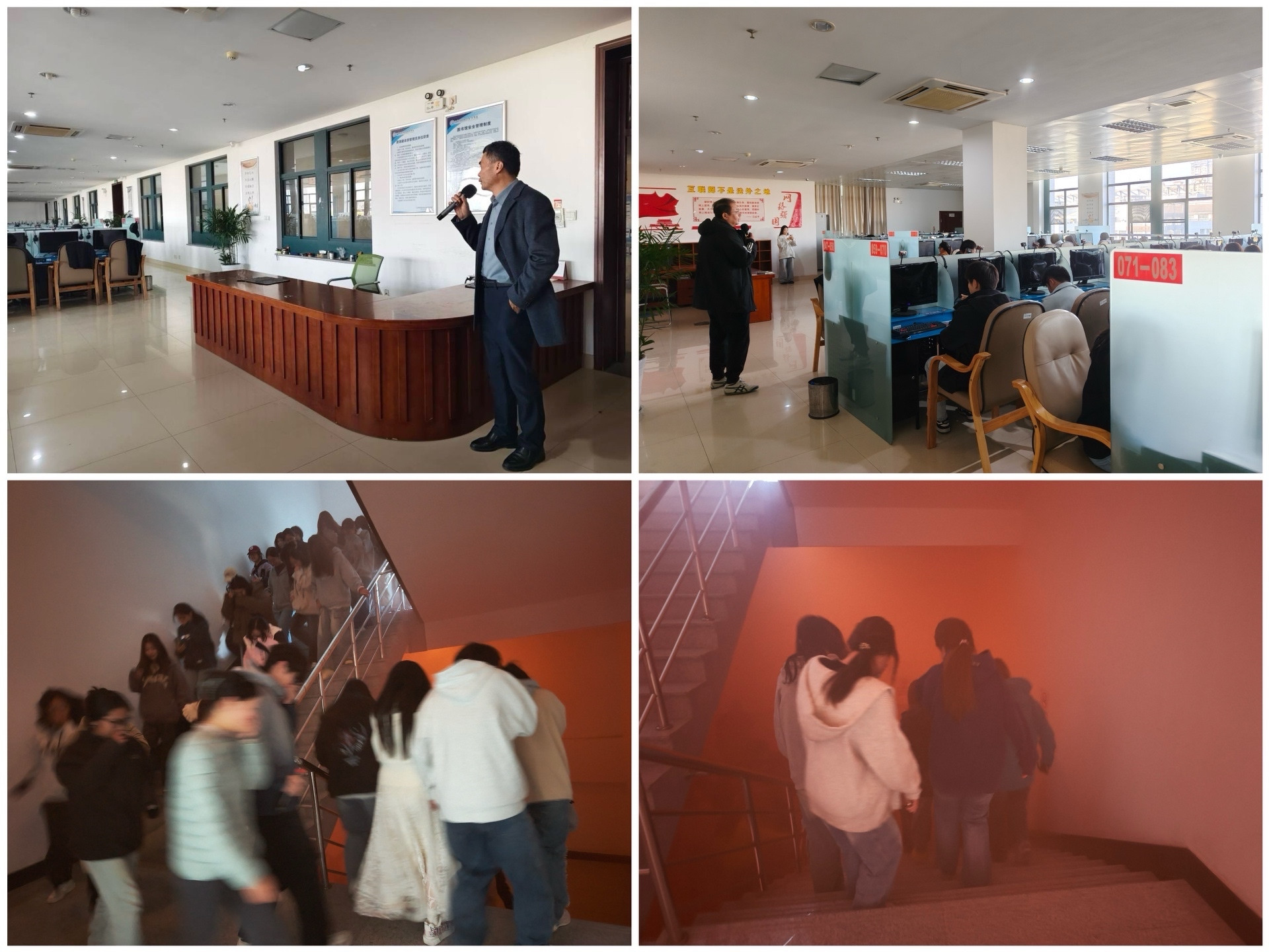 组织周密,演练流程规范有序。当天下午3时,消防疏散演练在学校图书馆电子阅览室准时启动。经管学院各班级学生积极响应、全员参与,提前抵达现场有序完成签到。保卫处马鸣处长亲临现场进行演练前的动员与安全叮嘱。随着演练指令的发出,全体参演学生在工作人员的专业引导下,严格遵循“湿毛巾捂口鼻、弯腰低姿”的逃生规范,沿预定疏散路线迅速、有序撤离至指定安全区域。整个过程组织严密、响应及时、行动规范,充分展现了师生良好的应急素养与协同配合能力。