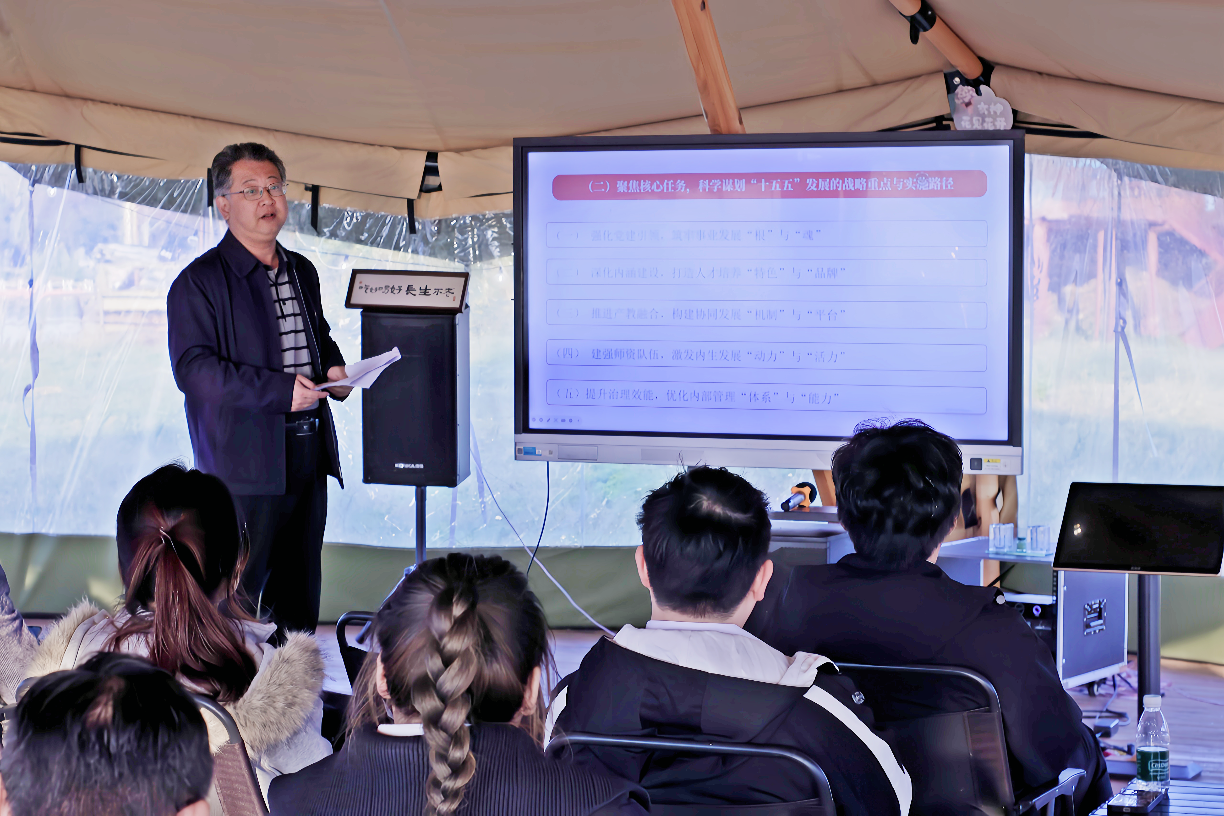 参观研学结束后,学院党总支书记卢海涛为全体党员开展了《以作风建设新成效赋能“十五五”发展新征程》的专题党课,学习“十五五”发展新征程对作风建设提出新要求,分析当前作风建设中的潜在问题,同时聚焦核心任务,启发全体师生党员从学科建设、人才培养、管理机制、师资队伍等多角度,建言献策,齐心协力谋划学院“十五五”发展的战略重点与实施路径。