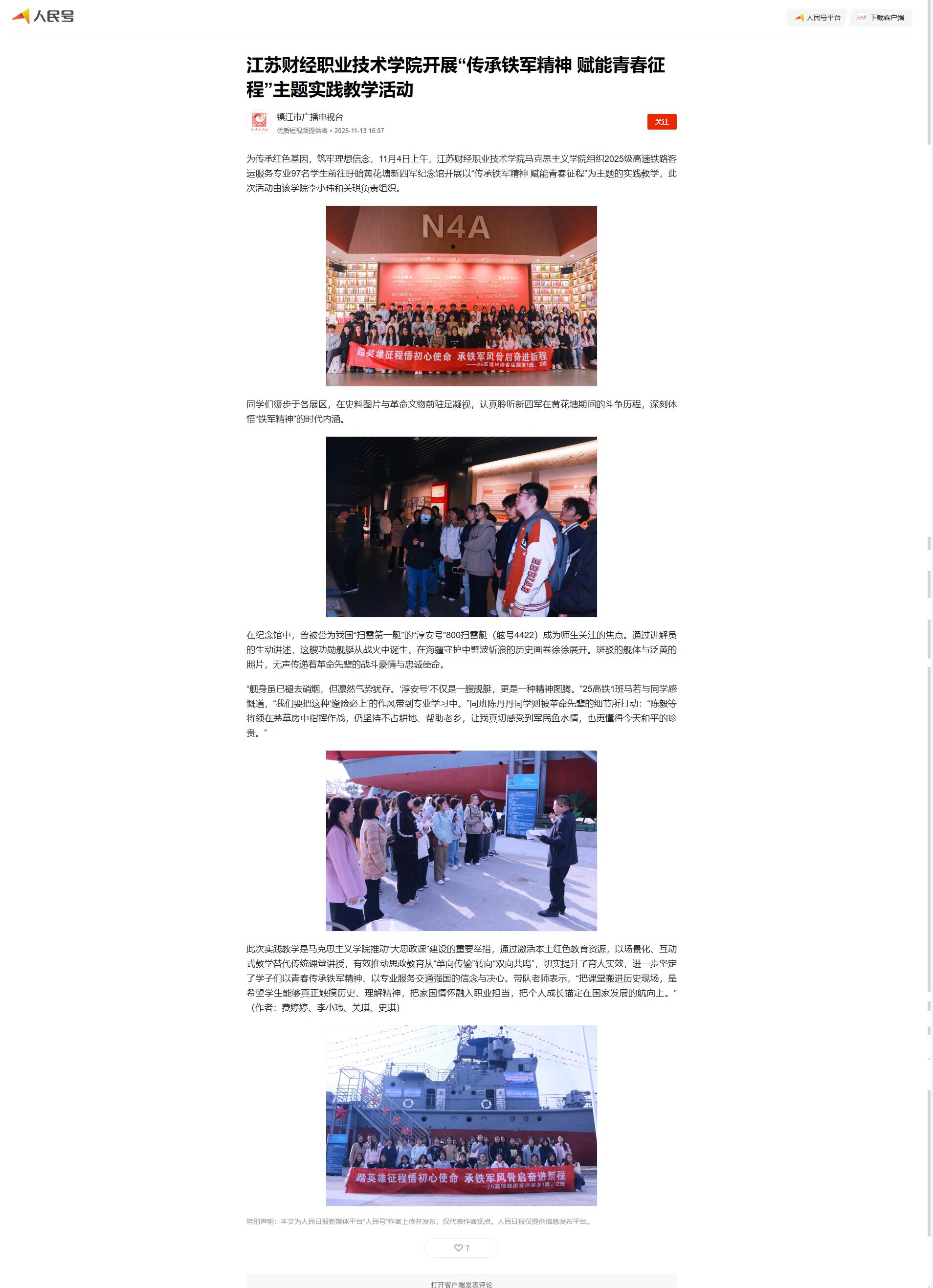 为传承红色基因,筑牢理想信念,11月4日上午,江苏财经职业技术学院马克思主义学院组织2025级高速铁路客运服务专业97名学生前往盱眙黄花塘新四军纪念馆开展以“传承铁军精神 赋能青春征程”为主题的实践教学,此次活动由该学院李小玮和关琪负责组织。