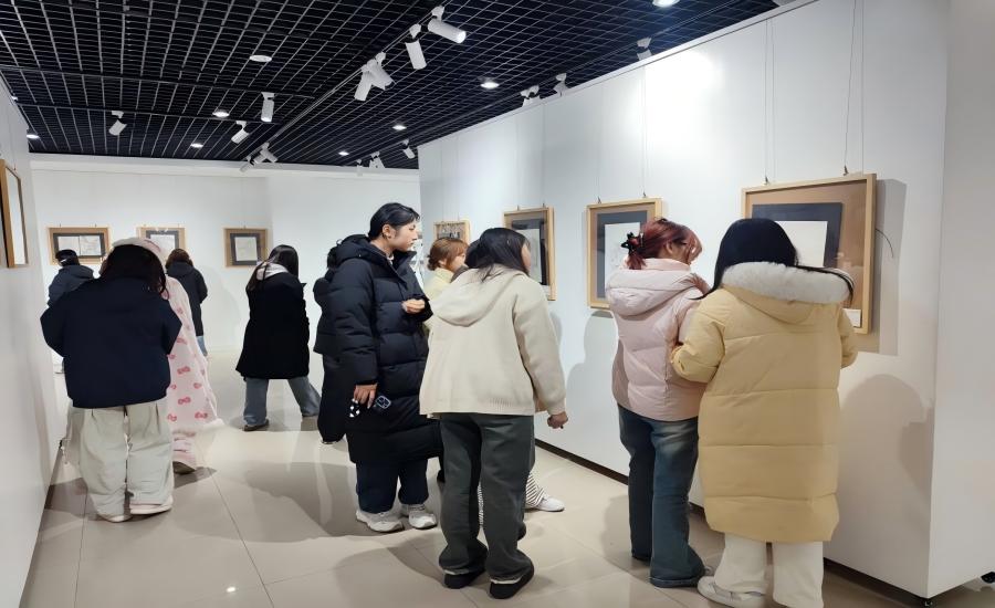 展厅里,白色展墙上错落挂着一幅幅作品,速写作品用简洁的线条呈现出古宅飞檐、河畔垂柳的模样,摄影作品则将乡村田野的晨光、古镇街巷的烟火气清晰定格。不少学生三五成群地站在作品前,有的指着速写里的细节轻声讨论线条的运用,有的拿着手机对着喜欢的摄影作品拍照记录,偶尔还能看到参展学生给同学讲解自己创作时的想法,展厅里满是轻松的交流氛围。