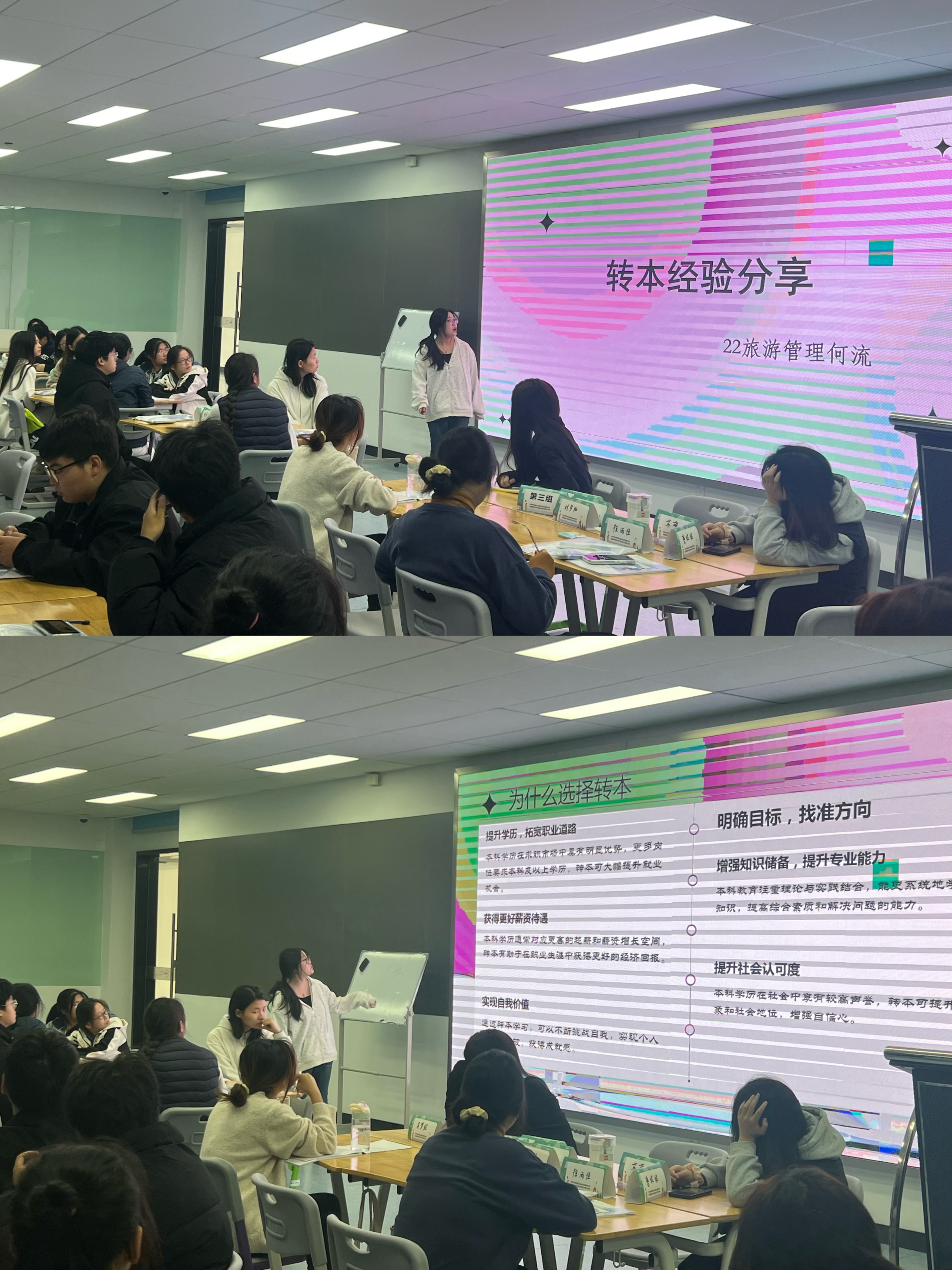 何流同学作为我院2022届旅游管理专业毕业生,当年以优异成绩通过专升本考试,现就读于淮阴工学院物流工程专业。作为曾经的财院学子,何流同学首先回顾了自己在江苏财经职业技术学院的学习时光,感谢母校老师的悉心教导和同窗的陪伴支持,言语间满是对母校的感恩之情。在分享会上,何流结合自身备考经历,从“目标确立”、“规划制定”、“科目复习”、“心态调整”四个核心方面展开分享。在明确目标环节,她强调要结合自身专业基础、兴趣爱好以及职业发展规划,理性选择报考院校和专业,避免盲目跟风。针对规划制定,她以自己的备考计划表为例,详细讲解了如何将备考周期划分为基础复习、强化提升、冲刺模拟三个阶段,并根据不同科目特点分配学习时间,让在场学生对备考规划有了清晰的认知。在科目复习技巧分享中,何流重点剖析了专升本公共课和专业课的复习要点。对于英语科目,她建议从词汇积累入手,坚持每天背诵定量单词,同时通过真题练习提升阅读和写作能力,还现场分享了自己整理的高频词汇手册和写作模板;针对专业课课程,她强调要吃透教材核心知识点,构建知识框架,通过错题整理和模拟刷题等方式巩固学习效果,尤其提醒大家要关注考试大纲的变化,精准把握考点。