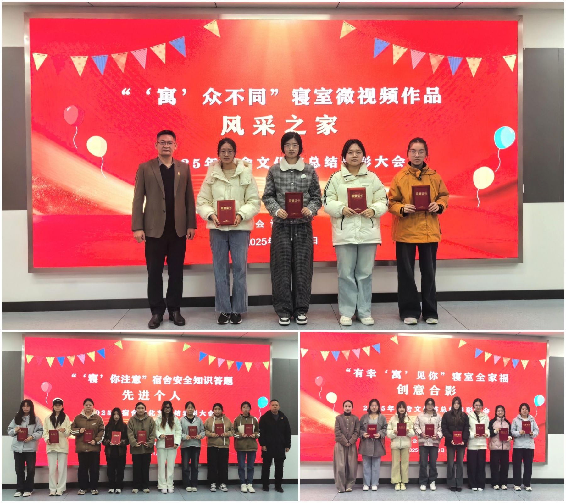 会议回顾了学院2025年宿舍文化节系列活动的精彩瞬间。在热烈的掌声中,与会教师分别为宿舍安全知识答题先进个人、寝室全家福创意合影、宿舍风采微视频作品等获奖代表颁发了荣誉证书。