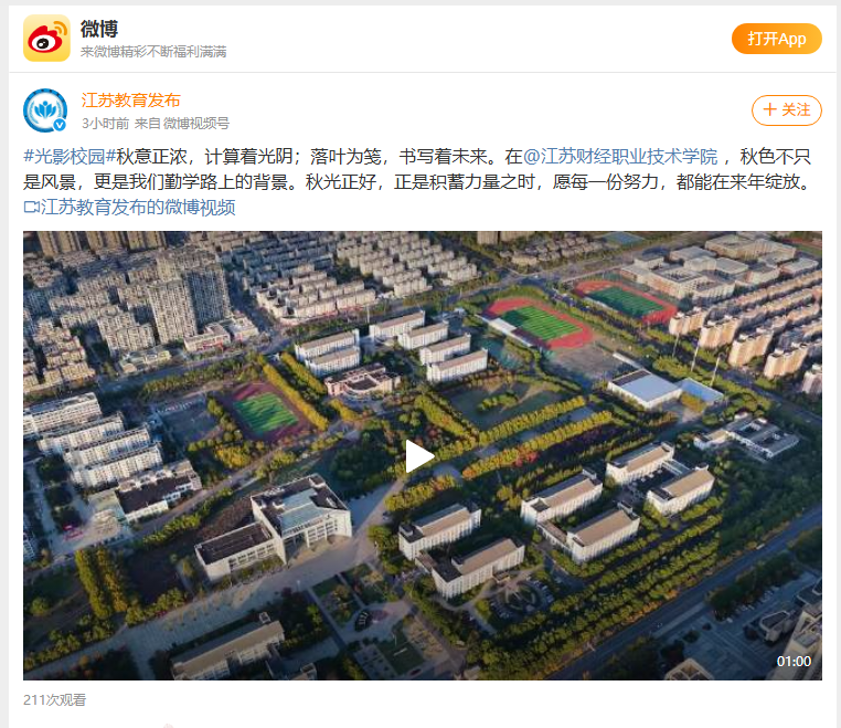 #光影校园#秋意正浓,计算着光阴;落叶为笺,书写着未来。在@江苏财经职业技术学院 ,秋色不只是风景,更是我们勤学路上的背景。秋光正好,正是积蓄力量之时,愿每一份努力,都能在来年绽放。