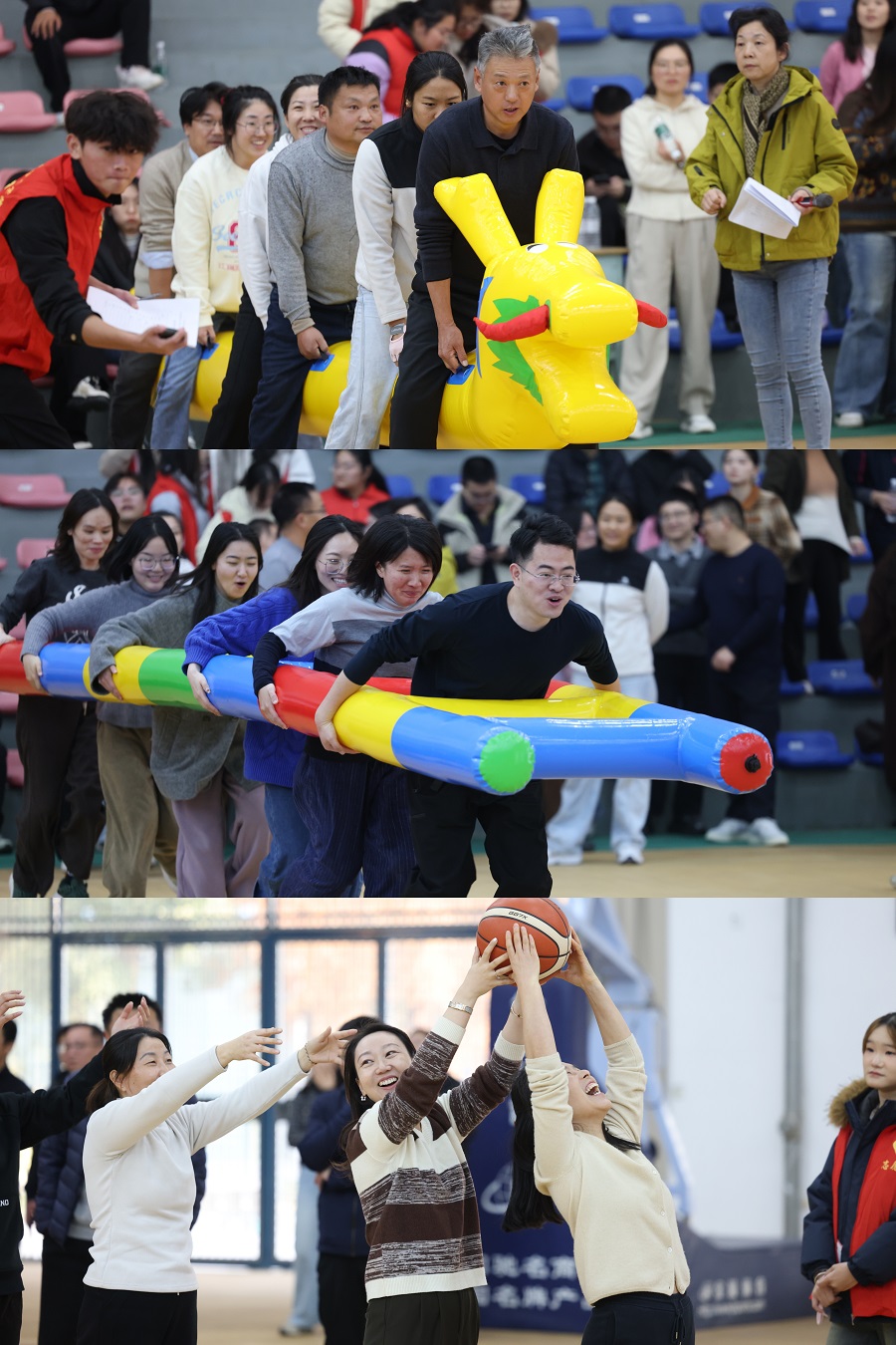 本次趣味运动会设有龙行天下、合力云梯、连珠传趣、力拔山河四个团体赛项,其中前三项为趣味团体赛,后一项为实力比拼赛。在“龙行天下”比赛中,各参赛队12名队员分两组分别站在两端,队员们骑着充气龙紧紧抓住把手,齐心协力,努力快速前进,在交换点迅速换人后再回到起点,默契的配合和不服输的劲头让比赛高潮迭起;在“合力云梯”赛项中,6名队员分站在梯格里,手持云梯,哨声一响,大家快速跑向交换点进行人员交换再将云梯送回终点,大家团结协作,你追我赶,每一次交接都是信任的传递;“连珠传趣”赛项则考验着队员们之间的协作能力,12名队员排成一队,通过精准的传递和默契的配合,让球快速完成头上传球和胯下传球,每一次成功传递都引来观众的阵阵欢呼。比赛现场,各分工会参赛队员们全身心投入,他们中有身先士卒的部门领导班子成员,有经验丰富的老教师,也有充满活力的年轻教师,大家不分职务、不分年龄,相互鼓励、相互支持,共同为团队荣誉而战,加油声、欢笑声此起彼伏。经过激烈的角逐,在趣味团体赛中,金融学院分工会荣获一等奖,基础教学部分工会、物流与交通旅游学院分工会获得二等奖;图书馆分工会、会计学院分工会、经济管理学院分工会获得三等奖。