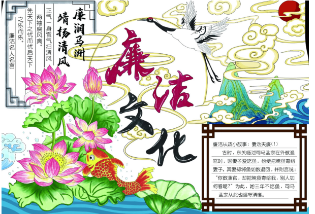 活动启动以来,同学们紧扣廉政主题,结合粮食行业特色与青年视角,将廉洁内涵融入创意设计。作品或通过简洁有力的线条传递坚守底线的信念,或用寓意深刻的色彩搭配诠释清风正气的追求,或结合“民以食为天,粮以廉为基”的行业理念,展现粮食人“崇廉、守廉、践廉”的职业追求。经前期宣传、作品征集、评委评审等环节,活动共收到18份优秀海报作品,最终评选出一、二、三等奖及优秀奖若干。24食品1班胡童和25食品1班张斯琦同学作品获本次活动一等奖,胡童同学结合AI创作手段以“清廉”为主题创作灵感,搭配荷花和仙鹤等传统元素,结合古代廉洁小故事,尽显清雅正气之风;张斯琦同学则以水墨笔触,生动诠释“廉洁”内涵,传递出深刻正向的价值导向。