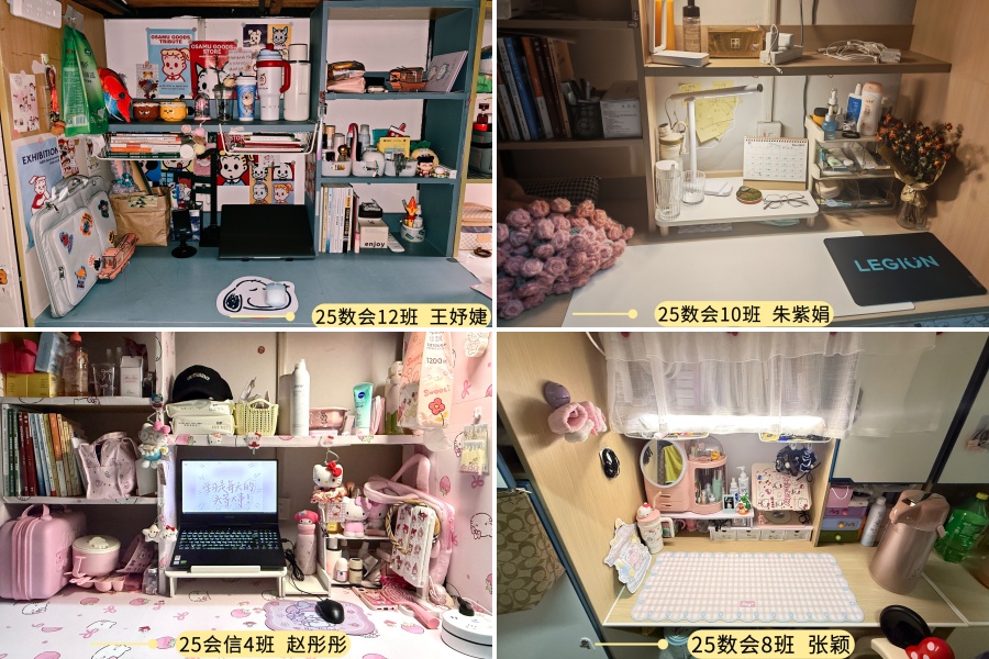 本次活动通过整理收纳、创意布置等方式,展现个人生活品味与学习态度。活动期间,各宿舍积极响应,同学们纷纷化身“空间改造师”,将原本简单的书桌打造成了兼具实用性与创意性的小天地:有的书桌以简约整洁为主调,书籍文具分类摆放,尽显学习的专注;有的融入绿植、手办、明信片、周边等元素,让书桌成为承载兴趣与记忆的温馨角落。一张张风格各异的书桌,不仅是同学们日常学习的小阵地,更是青春个性的鲜活表达。
