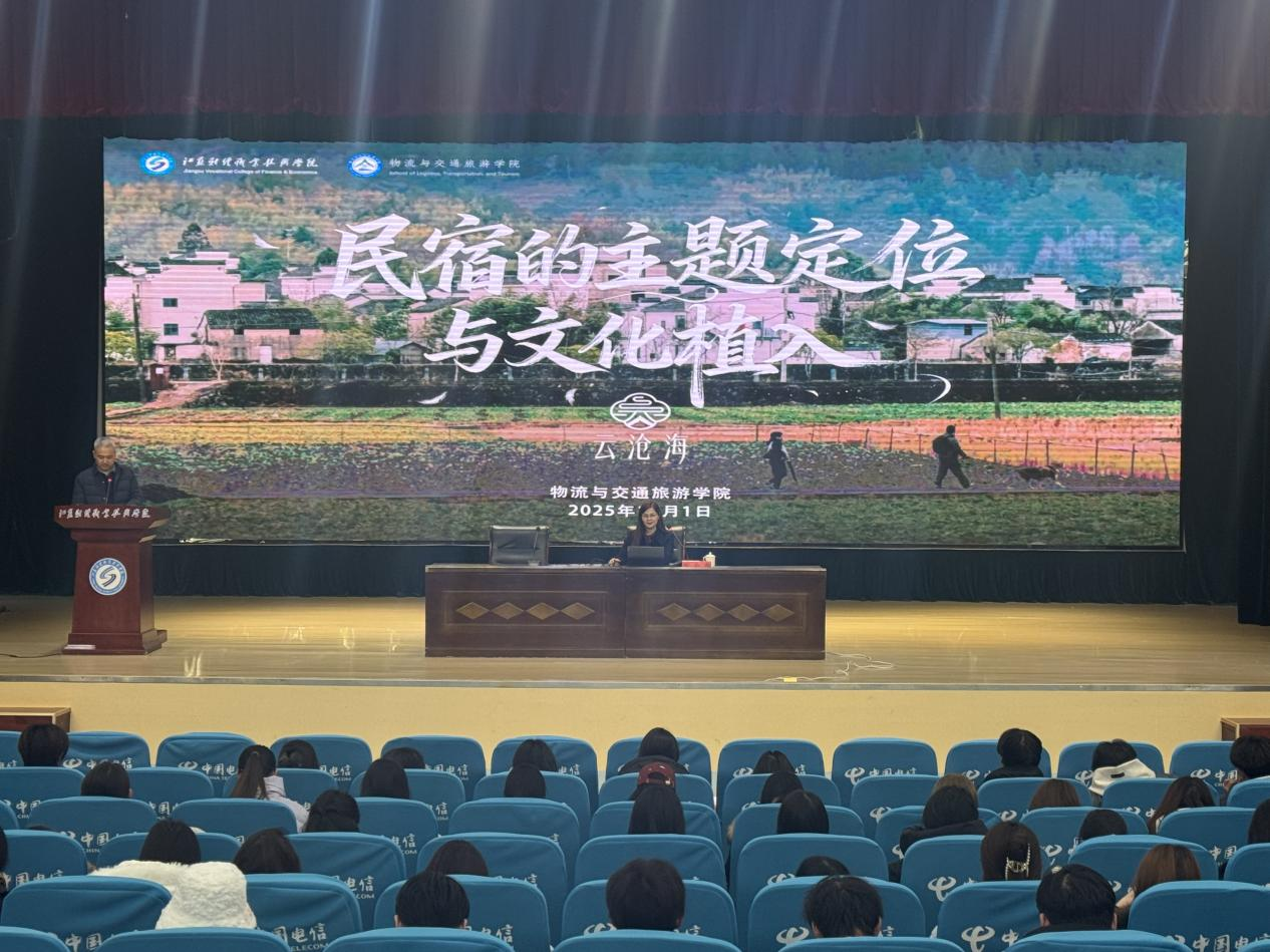 党的二十届四中全会指出,全面建设社会主义现代化国家,最艰巨最繁重的任务仍然在农村。发展乡村特色产业是拓展农民增收渠道的重要途径,民宿作为带动旅游发展、助力乡村振兴的重要载体,已成为农民增收的关键抓手。为帮助学校旅游管理专业学生树立正确就业观、提升创业能力,近日,我校特邀请淮安云沧海民宿创始人张小燕女士,带来题为“民宿的主题定位与文化植入”的专题讲座。学校党委委员、副校长梁枫,物流与交通旅游学院院长周爱群,党总支副书记孟英伟及旅游管理专业全体同学参加本次讲座。