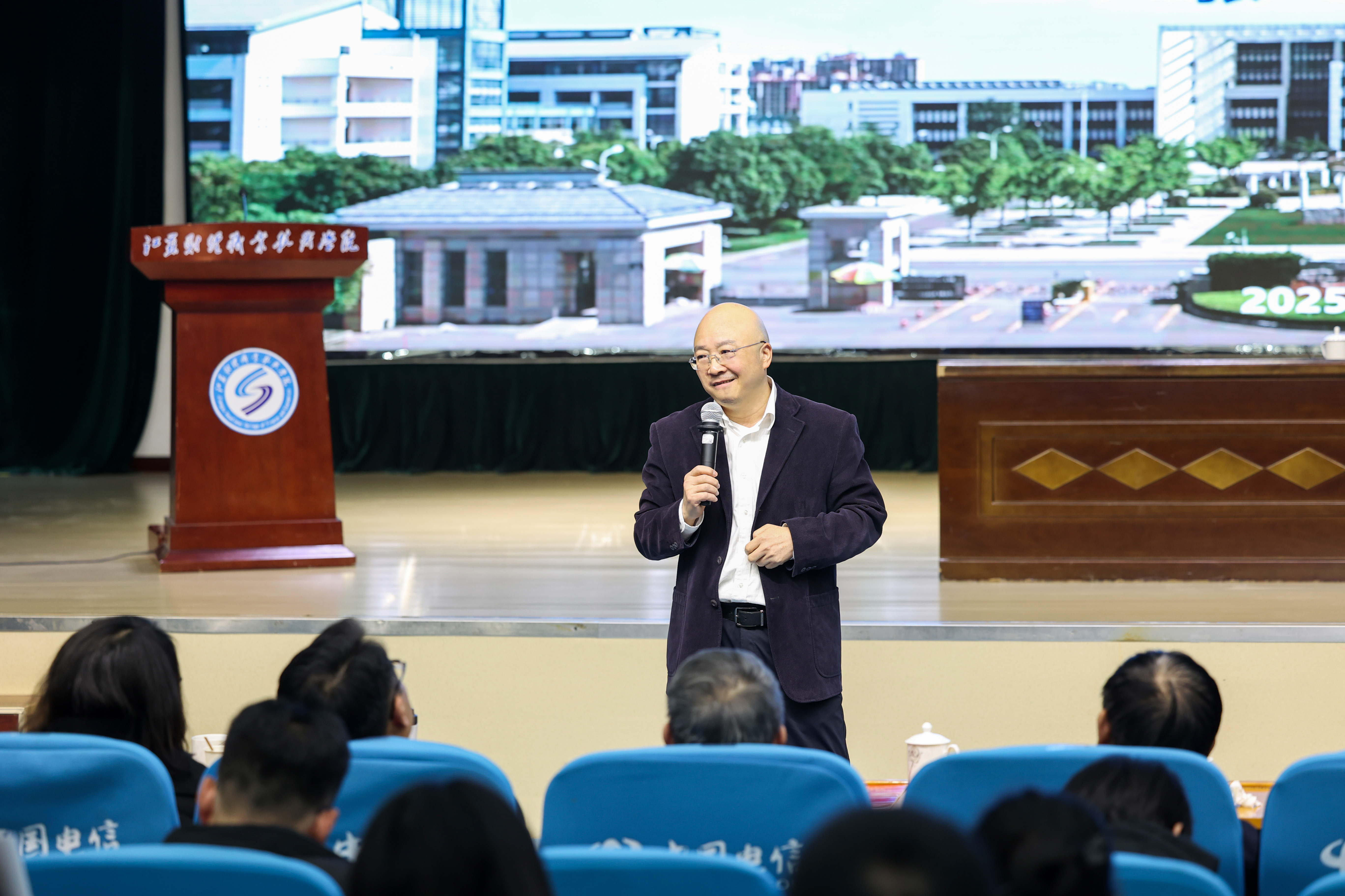 江苏财经职业技术学院党委委员、宣传部部长、马克思主义学院院长邹瑄主持大会主旨报告环节,四位专家学者带来了高水准的学术分享。江苏师范大学曹典顺教授以“数智时代的关键思维方式”为题,深刻剖析了数智技术对人类思维模式的重塑作用;南京师范大学曹孟勤教授围绕“人本质的对象化与AI技术风险”,探讨了人工智能发展背后的伦理困境与人文关怀;南京师范大学孙迎光教授从哲学基础理论出发,阐释了“此在和世界与主体和客体的关系”;江苏财经职业技术学院校长张维教授则结合高职教育实践,作“颠覆与爆改——当前高职教育的反思”报告,提出数智时代职业教育的转型路径。专家们的报告兼具理论深度与实践价值,引发与会者广泛共鸣。