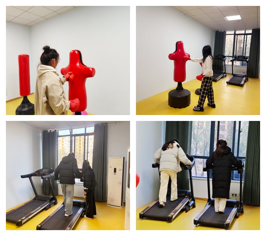 在宣泄室安全使用专业设备,体验压力释放;在团体辅导室观看心理科普视频并参与知识问答,学习心理健康知识。