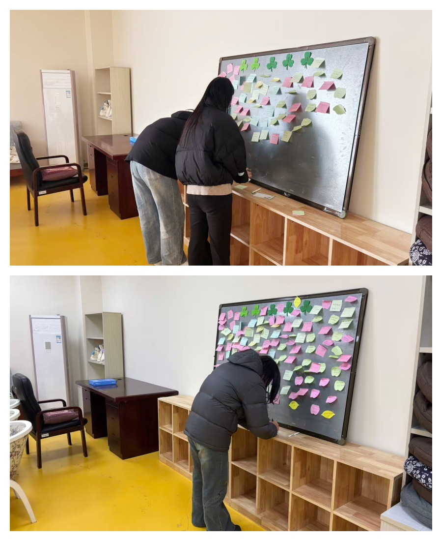 在积极心理体验中心书写感恩便利贴,共同构筑“感恩能量墙”。