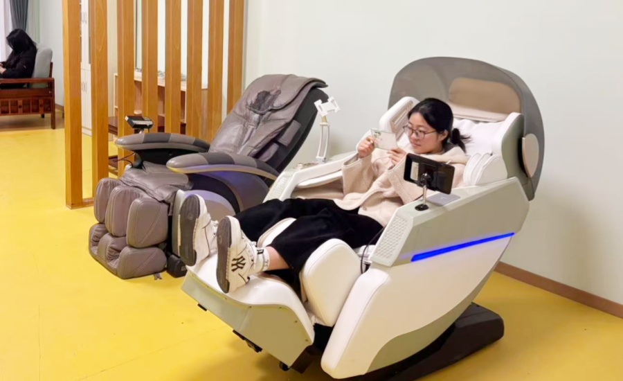 在放松室体验生物反馈放松椅并练习正念呼吸。