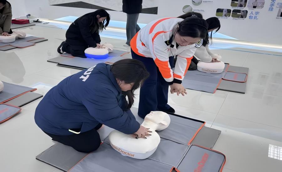 师生一行抵达淮安市疾病预防控制中心,通过"听讲解、看演示、亲操作"的方式,让师生们深入了解急救知识,沉浸式学习实用急救技能。在讲解员的引导下,师生们依次参观了红十字版块区、急救设备展示区、急救科普区等,了解了急救发展史、各种常见疾病和意外发生时的早期自救互救。接着,在互动体验环节,讲解员先通过模型演示,详细讲解了心肺复苏与海姆立克急救法的操作步骤。然后,大家分组进行操作体验,师生们轮流在模型上练习心肺复苏按压与人工呼吸,两两配合练习海姆立克急救法的操作手法,在实际操作中提升急救意识,掌握急救技能。