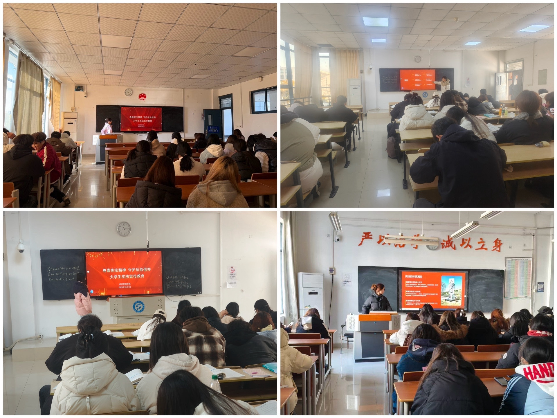 组织宪法主题班会,促进学习入脑入心。12月3日学院利用晚自习及课余时间,组织各班级围绕“尊崇宪法精神 守护法治信仰”主题,开展形式多样的宪法主题班会。班会中,辅导员与班干部依托学院统一制作的教学课件,系统讲解宪法的地位、作用与主要内容,并结合实际案例组织讨论交流。此次活动进一步深化了同学们对宪法核心要义的理解,有效增强了大家的规则意识与权利义务观念。