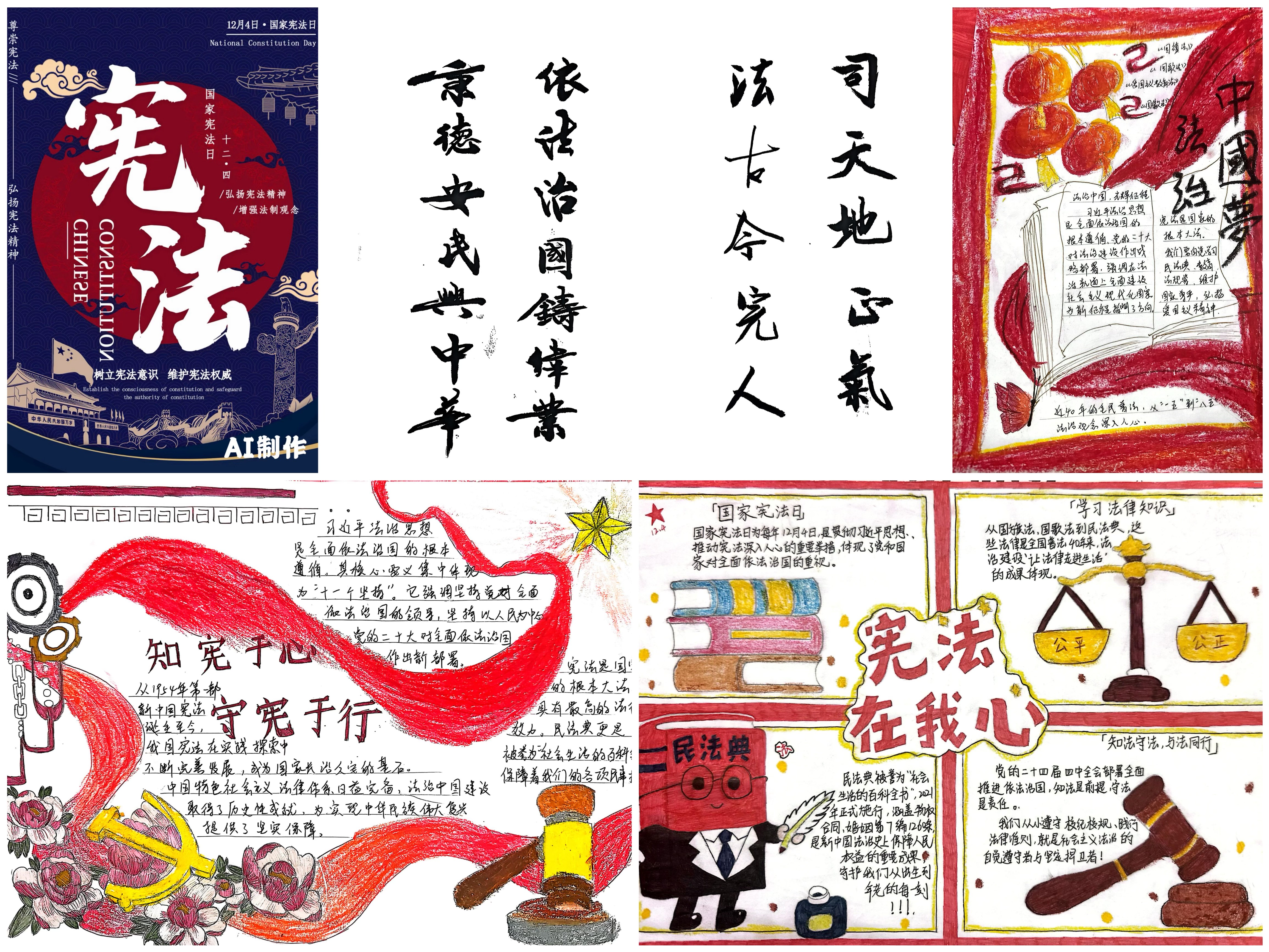创新宣传教育形式,展现法治学习成果。除集中学习外,学院鼓励师生结合专业与兴趣,通过书法、手绘和海报设计等多元AI艺术形式,捕捉校园法治瞬间,创作具有宪法法治内涵的作品。这些作品生动反映了师生对宪法精神的体悟与践行,丰富了普法宣传载体,让宪法学习更加鲜活生动、贴近人心。