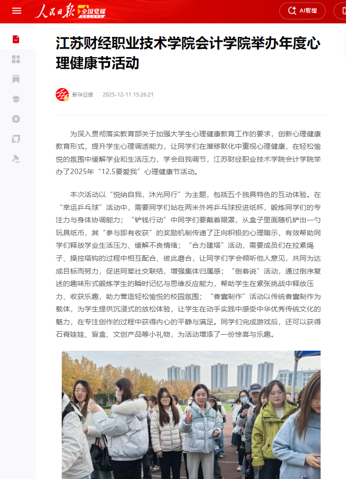 为深入贯彻落实教育部关于加强大学生心理健康教育工作的要求,创新心理健康教育形式,提升学生心理调适能力,让同学们在潜移默化中重视心理健康,在轻松愉悦的氛围中缓解学业和生活压力,学会自我调节,江苏财经职业技术学院会计学院举办了2025年“12.5要爱我”心理健康节活动。