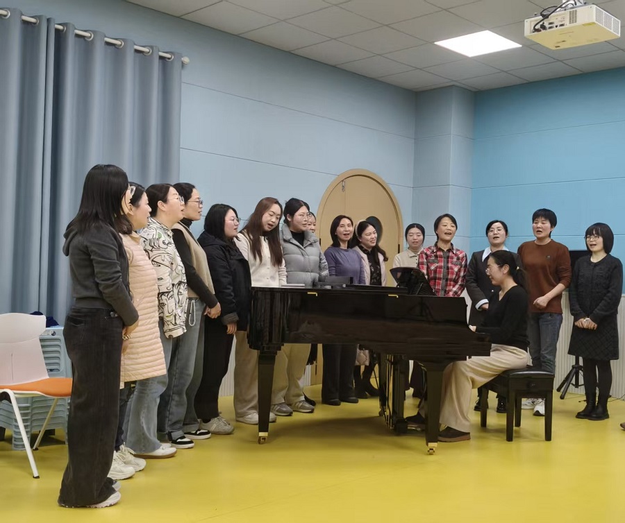 本次团建活动融合了“歌词接龙”“接歌不NG”“合唱”三项内容。16:30活动正式开始。首先进行的是“歌词接龙”,大家围坐成圆,由主持人开始唱出一句歌词,会员轮流接龙演唱,每位会员根据前一位会员所唱歌词最后一个字进行接龙。老师们全神贯注,你方唱罢我登场,展现了老师们丰富的音乐储备和敏捷的思维,大家围坐在一起唱歌,感觉瞬间拉近了距离。在“接歌不NG”环节,考验着大家的反应力与协作力。当经典歌曲《潇洒走一回》《稻香》等片段响起时,成员们抢麦报歌名接唱,时而因跑调引发笑声,时而因完美衔接赢得欢呼,活动现场气氛热烈,欢笑不断。最后,全体成员围绕在钢琴旁共同合唱经典曲目《月亮代表我的心》,和谐悠扬的歌声在教室中回荡,凝聚了团队的力量,也唱出了心中的愉悦。
