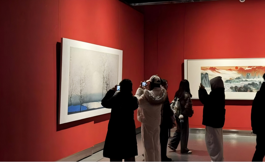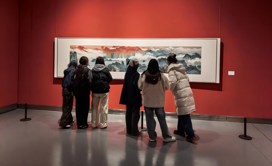 步入展厅,同学们沉浸于水墨丹青的艺术世界,在传统山水意境中汲取创作灵感。一幅幅山水画作或意境悠远,或笔墨苍劲,薛亮及其师生以精湛的技法勾勒出山河的灵秀与壮阔。画作中,青绿山水的雅致、水墨写意的磅礴,让同学们直观感受到中国传统山水画的独特韵味与文化底蕴。参观过程中,大家驻足凝视,时而轻声交流创作手法,时而用笔记录构图巧思,从笔墨晕染、色彩搭配到空间布局,细致地揣摩作品的艺术匠心。大家认为,传统山水画的留白技法、意境塑造,为当代视觉设计贡献了多样的创作灵感。大家将把本次观展的所得融入未来的专业学习,探寻传统美学与现代设计的结合方式。