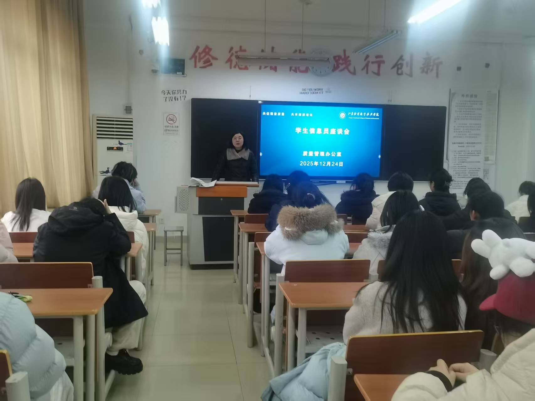 为深度了解课堂教学质量状况,12月24日下午,质量管理办公室在文汇楼303教室召开学生信息员座谈会,会议由质量管理办公室主任刘锦翠主持,各院部学生信息员代表参加。