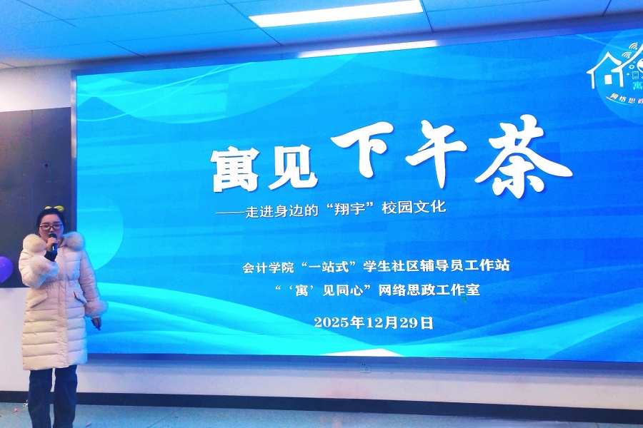 12月29日下午,会计学院在文泽楼一楼智慧教室举办“寓见下午茶”活动。此次活动由学院“一站式”学生社区辅导员工作站和“‘寓’见同心”网络思政工作室举办,四十余名师生齐聚一堂以“走进身边的‘翔宇’校园文化”为主题,共同探寻“努力学习,精益求精”校训的深刻内涵,完成了一次别开生面的文化寻根与思想对话。