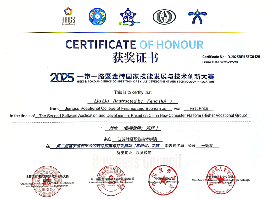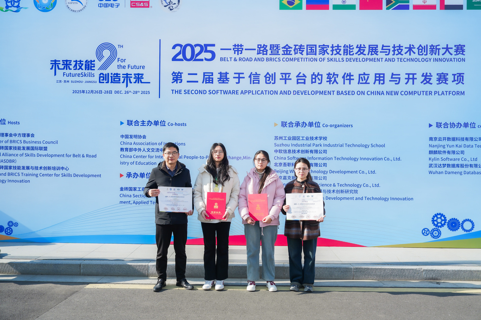12月26日至28日,由金砖国家工商理事会中方理事会、“一带一路”暨金砖国家技能发展国际联盟等权威机构联合主办的2025年“一带一路”暨金砖国家技能发展与技术创新大赛——第二届基于信创平台的软件应用与开发赛项总决赛在苏州工业园区工业技术学校落下帷幕,本次赛事共吸引全国104所院校的223名选手参赛。智能工程技术学院24物联网班刘柳、李杨雪同学在冯辉、陆铁文两位老师的精心指导下,凭借过硬的专业素养和出色的临场表现,分别斩获国赛一等奖和优秀奖。学校因在赛事组织协调工作中表现突出,荣获赛项“最佳组织奖”,指导教师冯辉也获评“优秀指导教师”称号,充分彰显了我校在信创领域技术技能人才培养的扎实成效与鲜明特色。