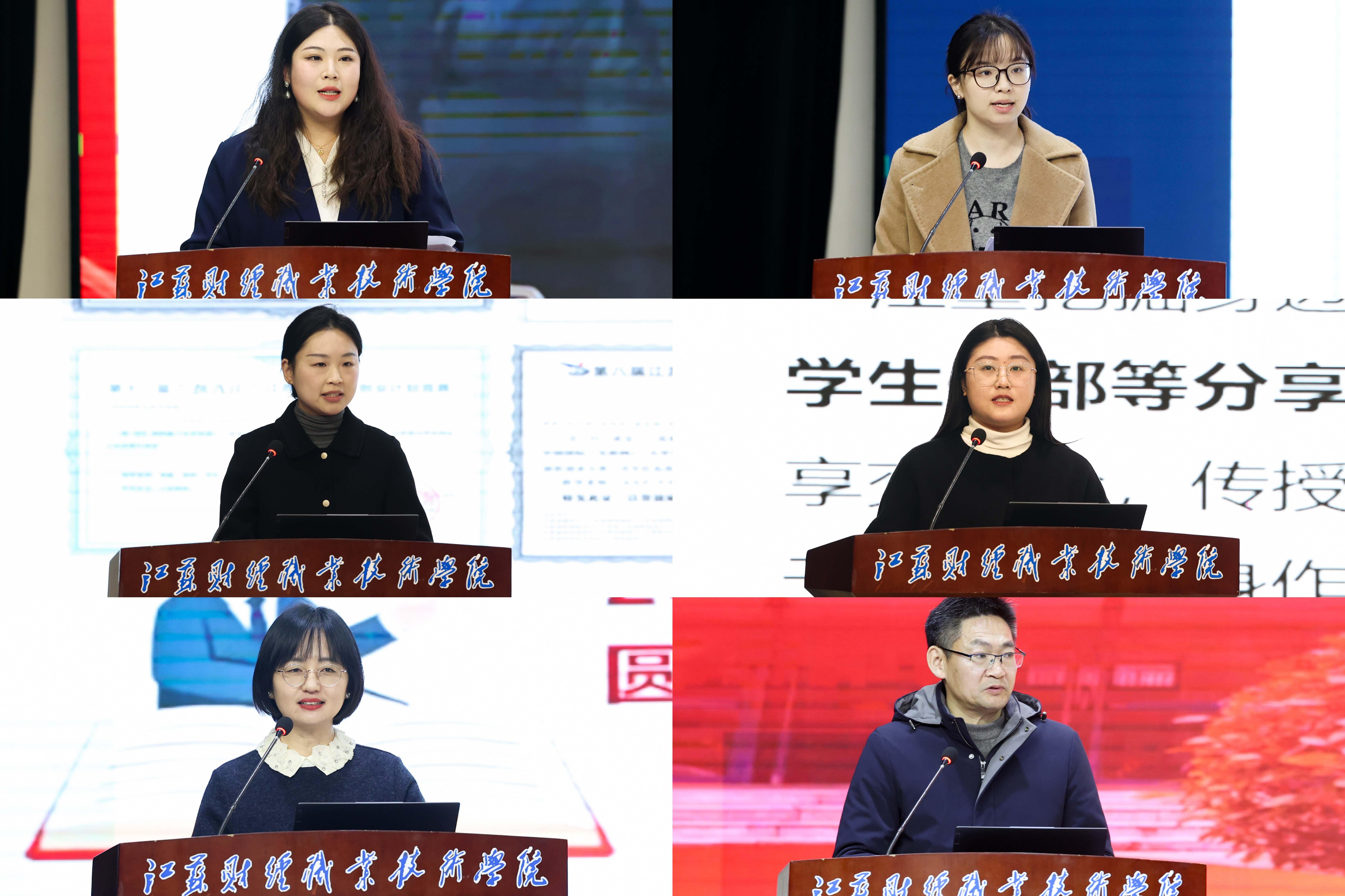 会上,对2025年度“推普助力乡村振兴”全国大学生暑期社会实践志愿服务活动优秀团队、江苏省五四红旗团委,以及在江苏省高校团干部思政技能大比武、第九届“启航杯”江苏省高职院校新教师教学竞赛、江苏省高职院校思政课教师教学展示中获奖的团队和个人进行了表彰。马克思主义学院教师杨瑞、物流与交通旅游学院教师徐笛、金融学院辅导员阚晨雨、法律与人文艺术学院辅导员朱梦圆、马克思主义学院教师孟文玉、会计学院党总支书记罗斌,围绕课程育人、实践育人、网络育人和二级党组织书记如何抓好思想政治和意识形态工作等主题进行了交流发言。