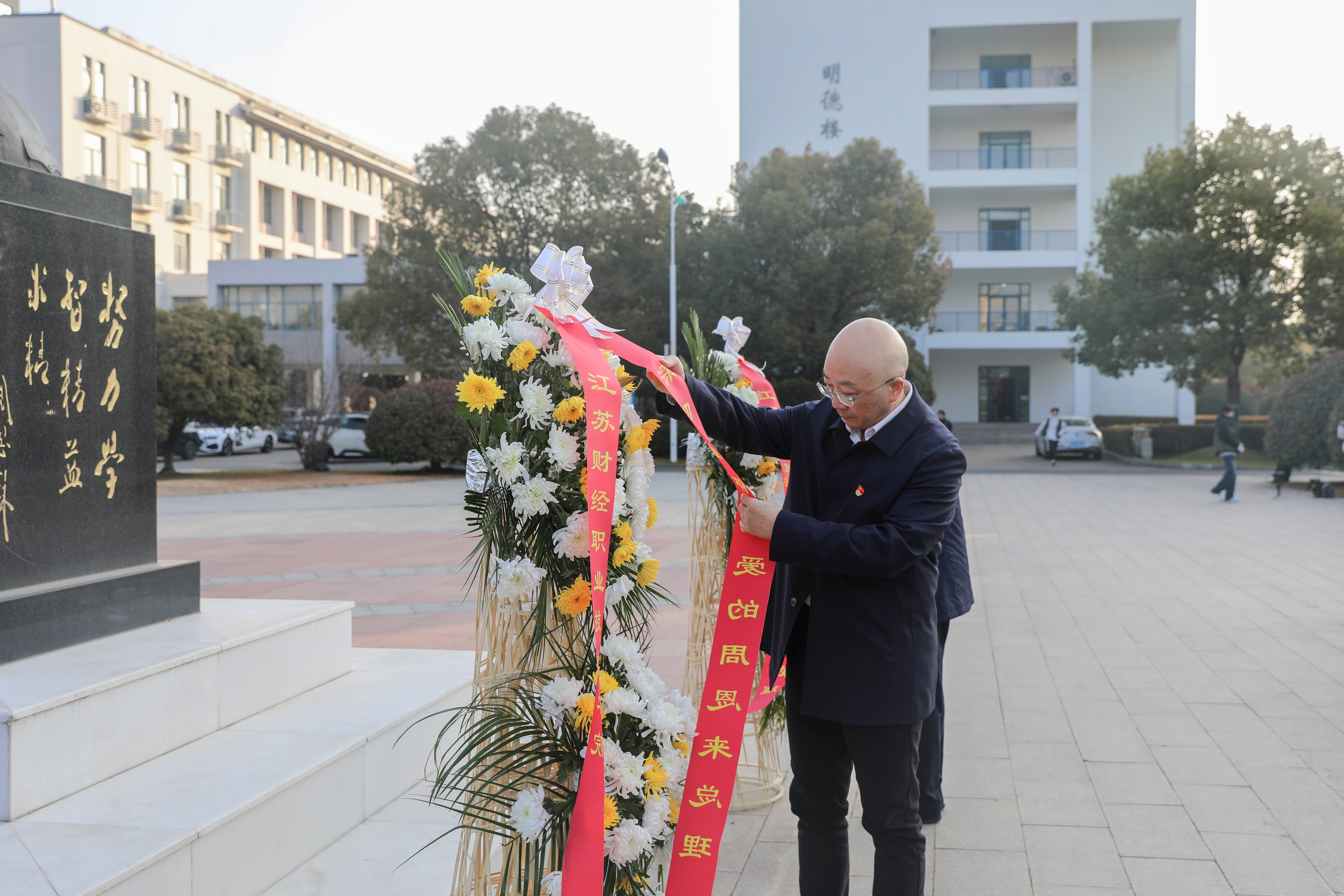 敬献花篮环节,4名学生代表迈着沉稳的步伐,缓缓走向周恩来铜像,将承载着全校师生深切思念的花篮整齐摆放在铜像基座前。校党委书记闫超栋、校长张维共同上前,小心翼翼地整理花篮缎带,让“深切缅怀敬爱的周恩来总理”的字样醒目舒展。整理缎带后肃立鞠躬,致以无限哀思。全体人员集体默哀,表达对伟人的无限敬仰与深切缅怀。