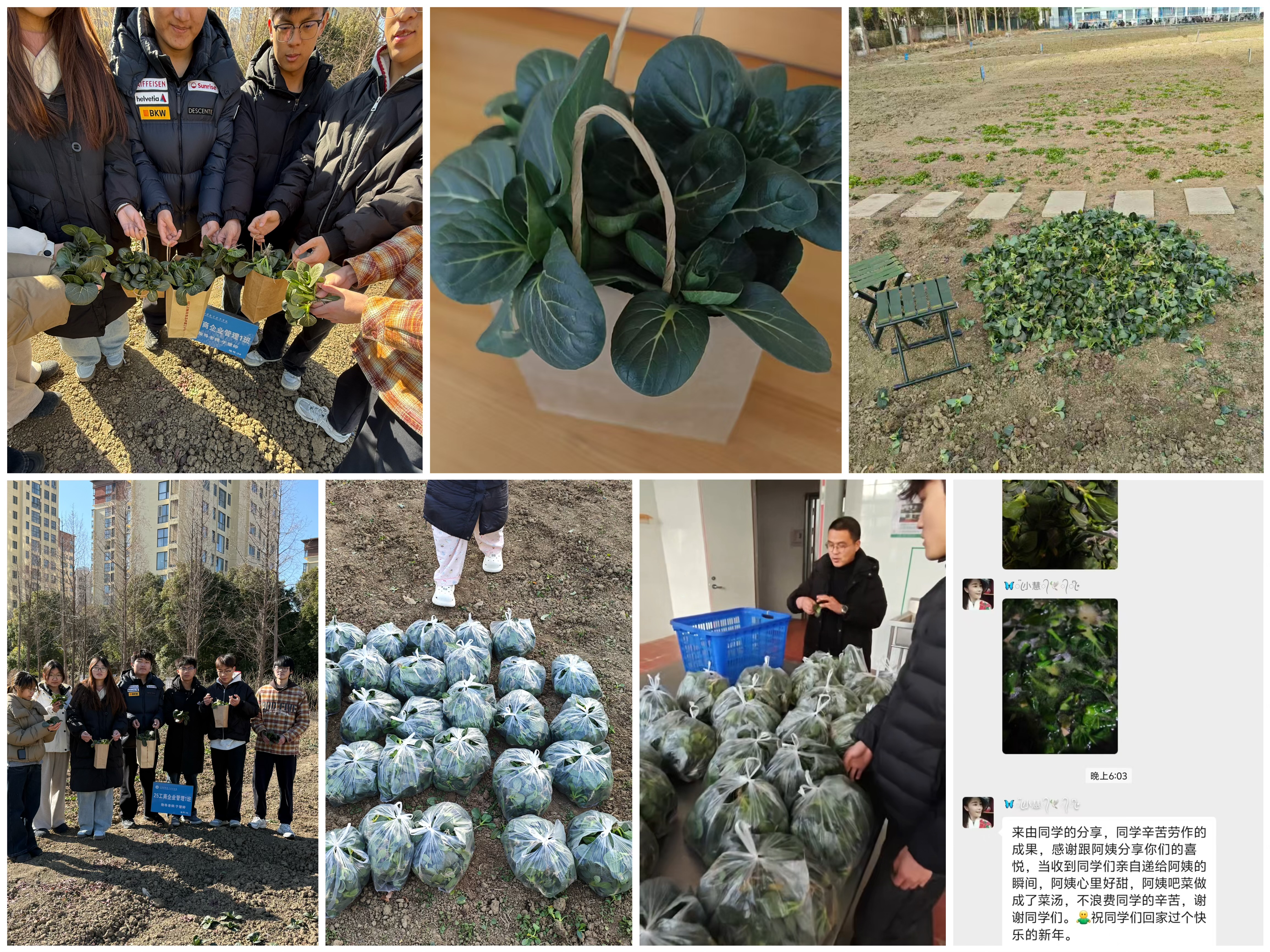 当一筐筐整理好的青菜整齐排列时,同学们看着自己种出的成果,脸上满是喜悦。25跨境1班将部分青菜送给老师,另一部分送往学校食堂,并完成了收购结算,劳动所得纳入班费;25工管1班则将青菜分享给同学与宿管阿姨。每一份传递,都让这份收获超越了蔬菜本身,成为情感与心意的载体。