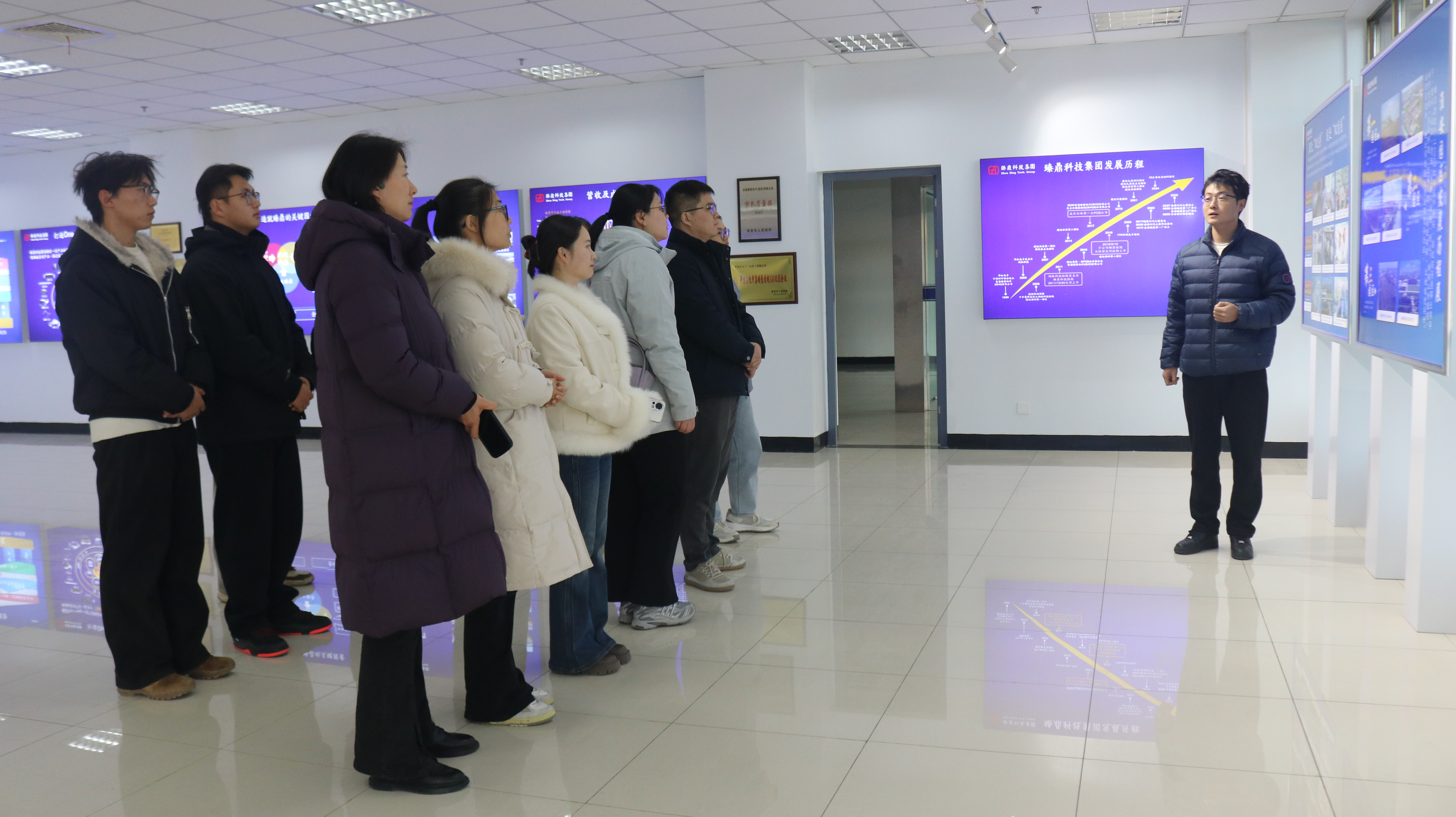 在鹏鼎控股人力资源部部长宋明、校企合作办公室主任倪飞成等企业高管的陪同下,学院一行首先参观了企业现代化展厅。人力资源部部长助理赵帅详细介绍了鹏鼎控股的发展历程、核心技术优势及行业领先地位,生动展现了智能制造业的前沿发展态势与广阔市场前景,让师生们沉浸式感受产业发展脉动,对行业岗位需求有了更直观的认知。