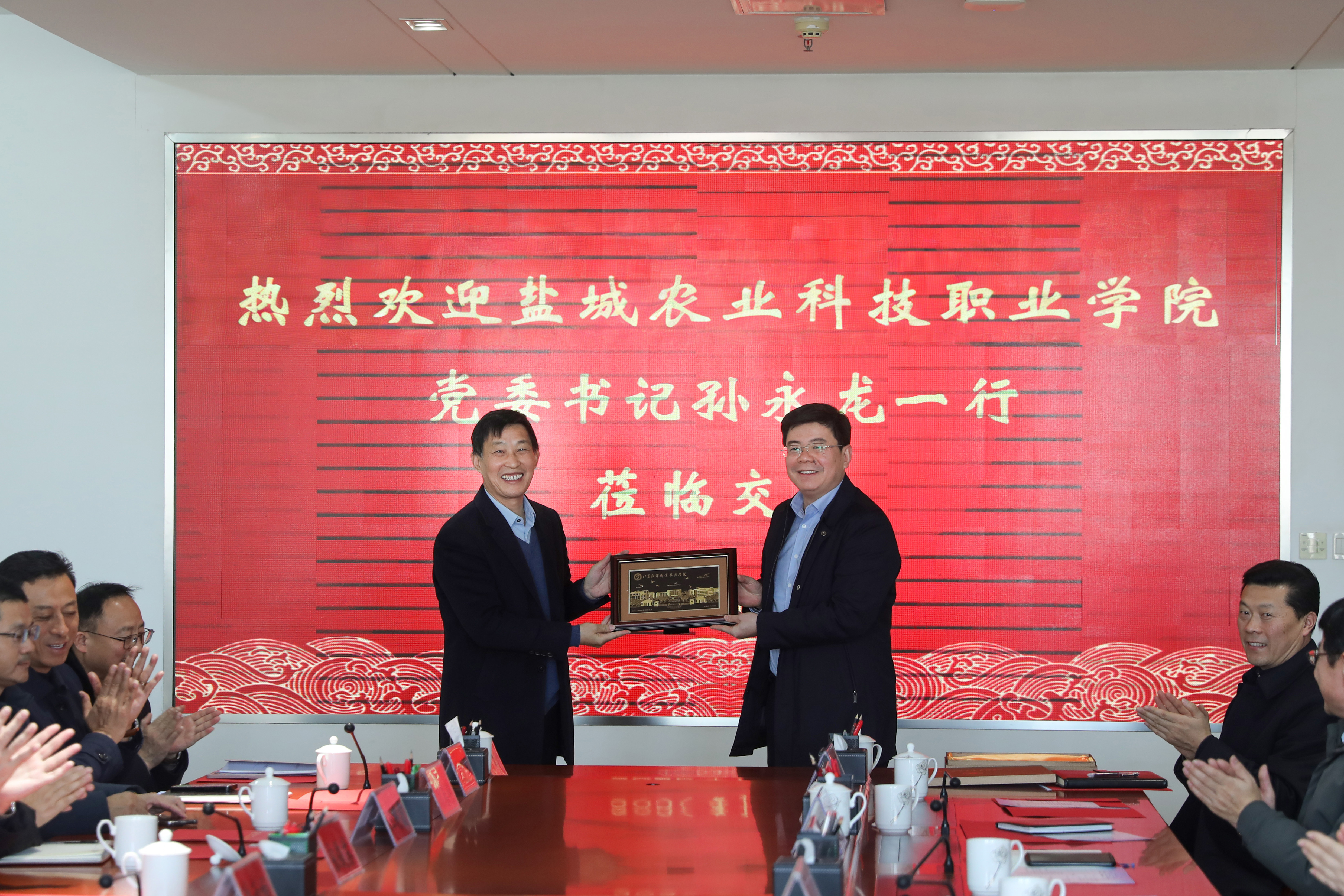 1月9日,盐城农业科技职业学院党委书记孙永龙带领纪委书记许为柏、副校长束秀玉、副校长宋俊苏等领导一行莅临我校调研交流。我校党委书记闫超栋与副校长鲍建青热情接待了来访嘉宾。