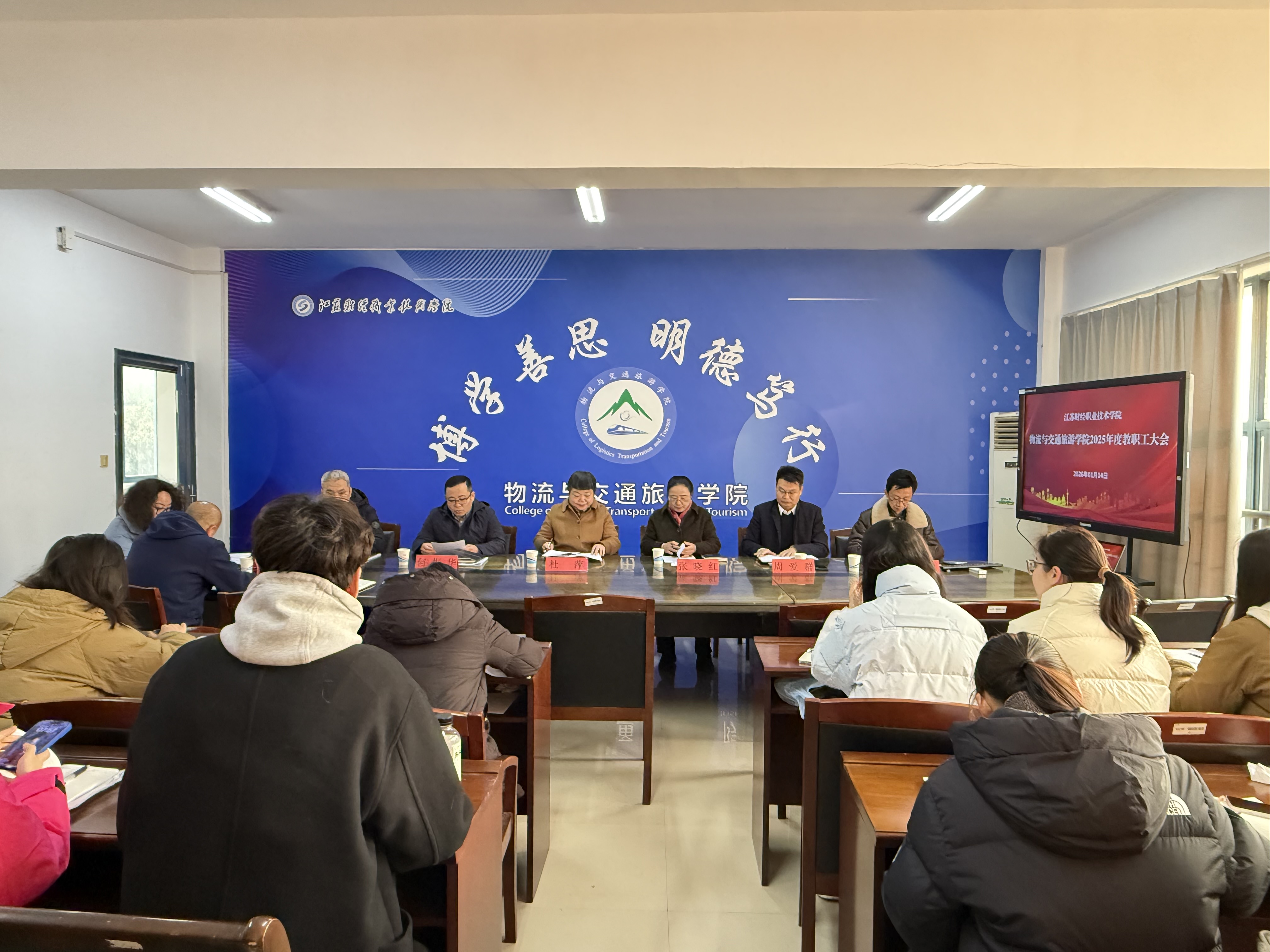 1月14日上午,物流与交通旅游学院2025年度教职工大会在躬行楼206会议室召开。学校党委委员、党委副书记杜萍,学校工会常务副主席张晓红出席会议,学院全体教职工参会。