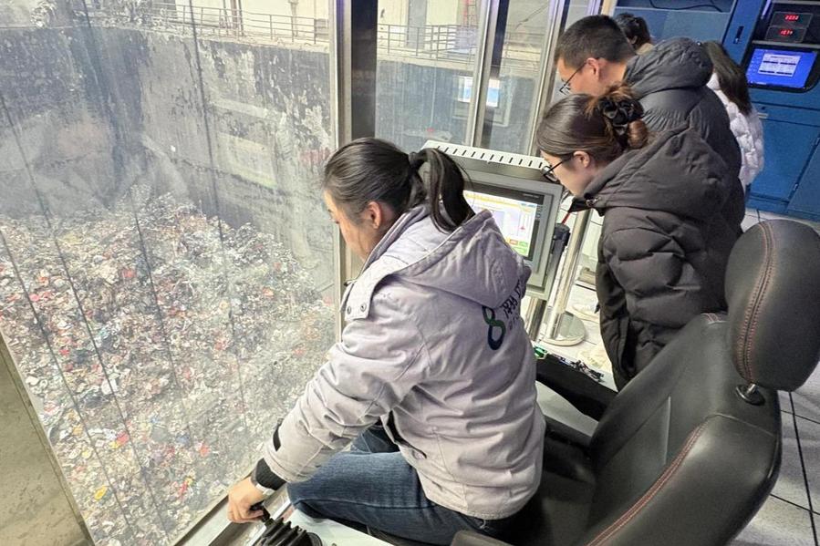 活动伊始,企业负责人围绕公司发展历程、固废处理规模及资源化利用成效作详细介绍,重点讲解了“无害化处理 — 资源化回收 — 清洁能源转化”的闭环处置模式。在技术人员的带领下,党员师生依次走进环保科普展厅、焚烧发电主控室及智能分拣中心。车间内,自动化分拣设备精准分离可回收物与有害垃圾,传送带有序输送固废至焚烧炉;中控室里,技术人员通过数字化监控系统实时调控焚烧温度、烟气净化等关键指标,屏幕上实时更新的污染物排放数据,直观展现了“零污染、全利用”的处理成效。
