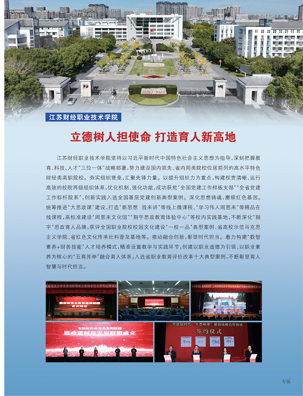 江苏财经职业技术学院坚持以习近平新时代中国特色社会主义思想为指导,深刻把握教育、科技、人才“三位一体”战略部署,努力建设国内领先、省内同类院校位居前列的高水平特色财经类高职院校。夯实组织堡垒,汇聚先锋力量。以提升组织力为重点,构建权责清晰、运行高效的校院两级组织体系,优化机制、强化功能,成功获批“全国党建工作样板支部”、“全省党建工作标杆院系”,创新实践入选全国基层党建创新典型案例。深化思想铸魂,赓续红色基因。统筹推进“大思政课”建设,打造“新思想 我来讲”等线上课程、“学习伟人周恩来”等精品在线课程,高标准建设“周恩来文化馆”“翔宇思政教育体验中心”等校内实践基地,不断深化“翔宇”思政育人品牌,获评全国职业院校校园文化建设“一校一品”典型案例、省高校示范马克思主义学院、省红色文化传承社科普及基地等。推动融合创新,彰显时代担当。着力构建“数智素养+财务技能”人才培养模式,精准设置教学与实践环节,创建以职业道德为引领、以职业素养为核心的“五育并举"融合育人体系,入选省职业教育评价改革十大典型案例,不断彰显育人智慧与时代担当。