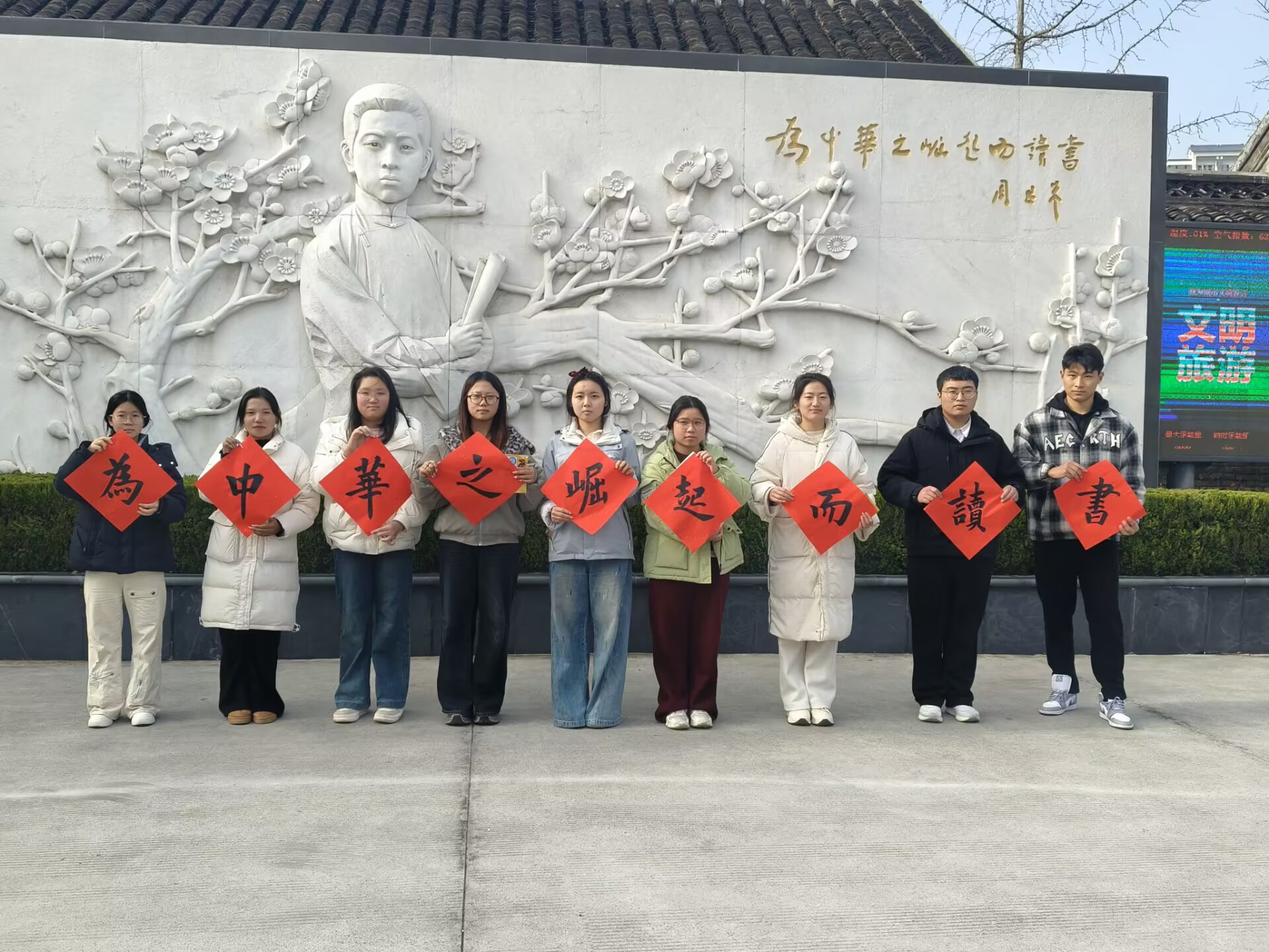 活动尾声,大家认真书写“立志卡”,用笔墨记录青春誓言,并在周恩来画像浮雕前庄严重温入团誓词。铿锵有力的誓言在院内回荡,映照着青年学子的坚定初心。