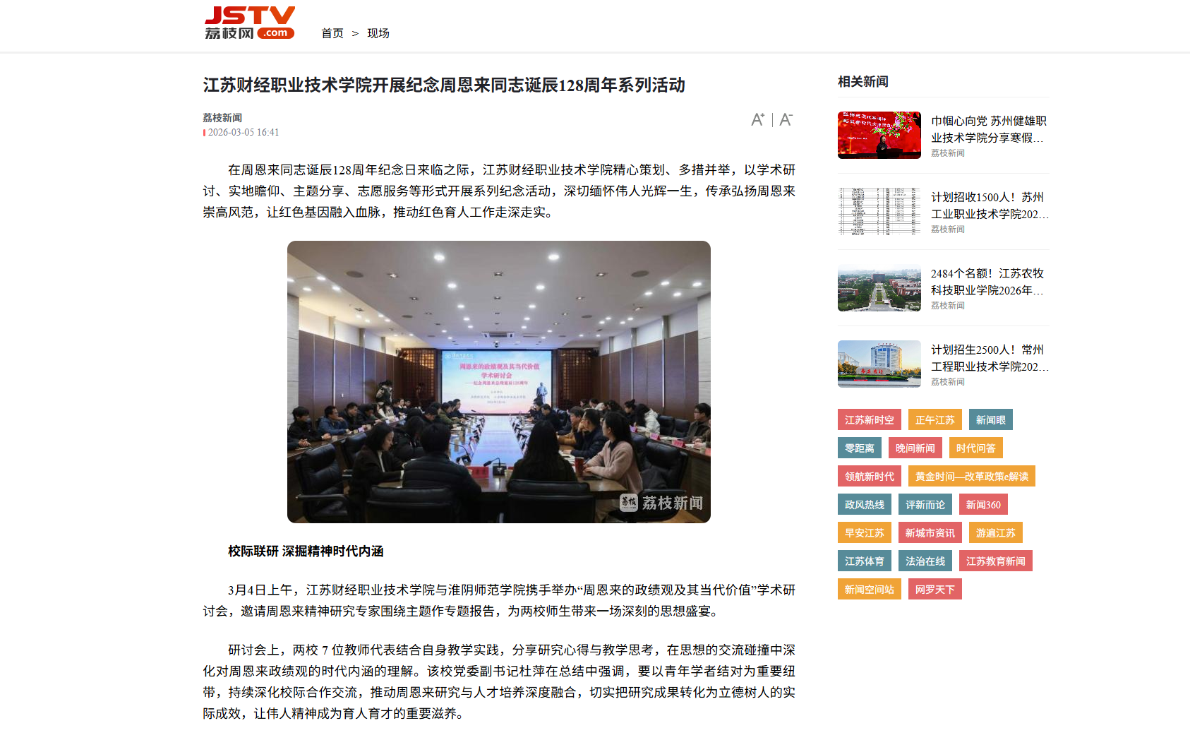 此次开展的系列活动,是江苏财经职业技术学院深化红色育人、厚植师生家国情怀的具体举措。活动既通过校际学术研讨,深挖周恩来政绩观与崇高风范的时代内涵,为红色育人注入理论深度;又以多元化的实践活动,让师生在亲身体验中加深对伟人精神的理解与感悟,让红色教育更有温度、更具实效。