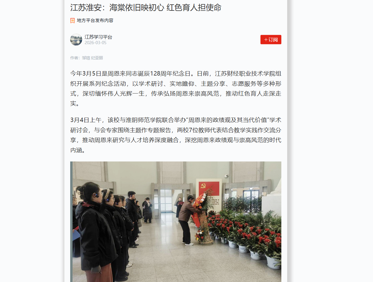 今年3月5日是周恩来同志诞辰128周年纪念日。日前,江苏财经职业技术学院组织开展系列纪念活动,以学术研讨、实地瞻仰、主题分享、志愿服务等多种形式,深切缅怀伟人光辉一生,传承弘扬周恩来崇高风范,推动红色育人走深走实。