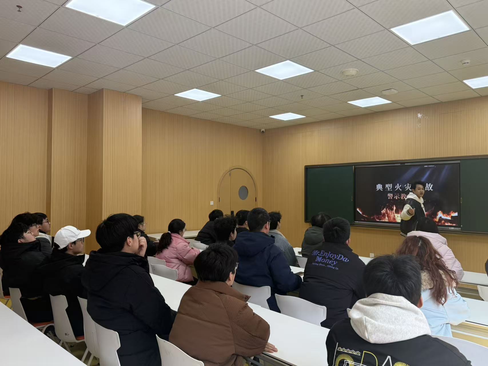 反诈宣传结束后,进入消防安全警示教育阶段。全体参会人员集中观看火灾事故警示教育片,影片以真实案例还原火灾蔓延过程,剖析事故原因,揭示用火用电不当、消防意识薄弱的严重危害,为校园消防安全敲响警钟。