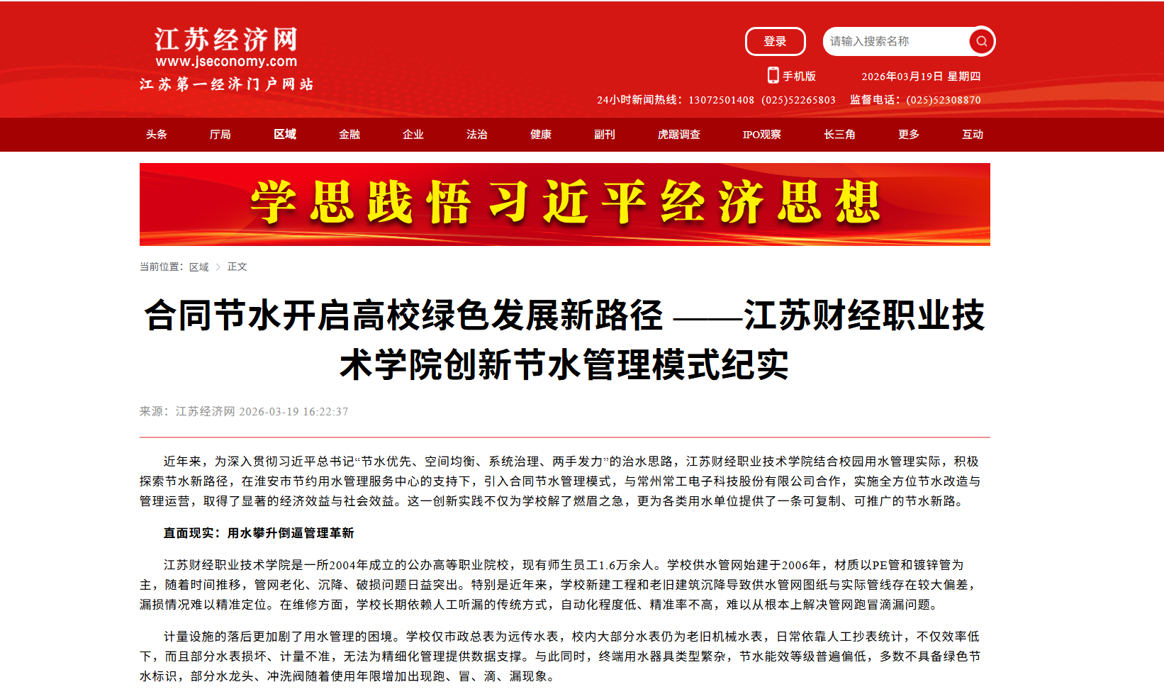 合同节水,不仅是一项技术改造,更是一场管理革新。它用市场化机制激活了节水的内生动力,用智能化手段提升了管理的精细化水平,用共赢模式破解了长期困扰的难题。江苏财经职业技术学院的探索实践,为高校乃至各类公共机构的节水工作提供了新思路、新路径、新样板,也为推动绿色发展、建设节水型社会贡献了“财院方案”。 (曾征宇 钟长春 郭剑)