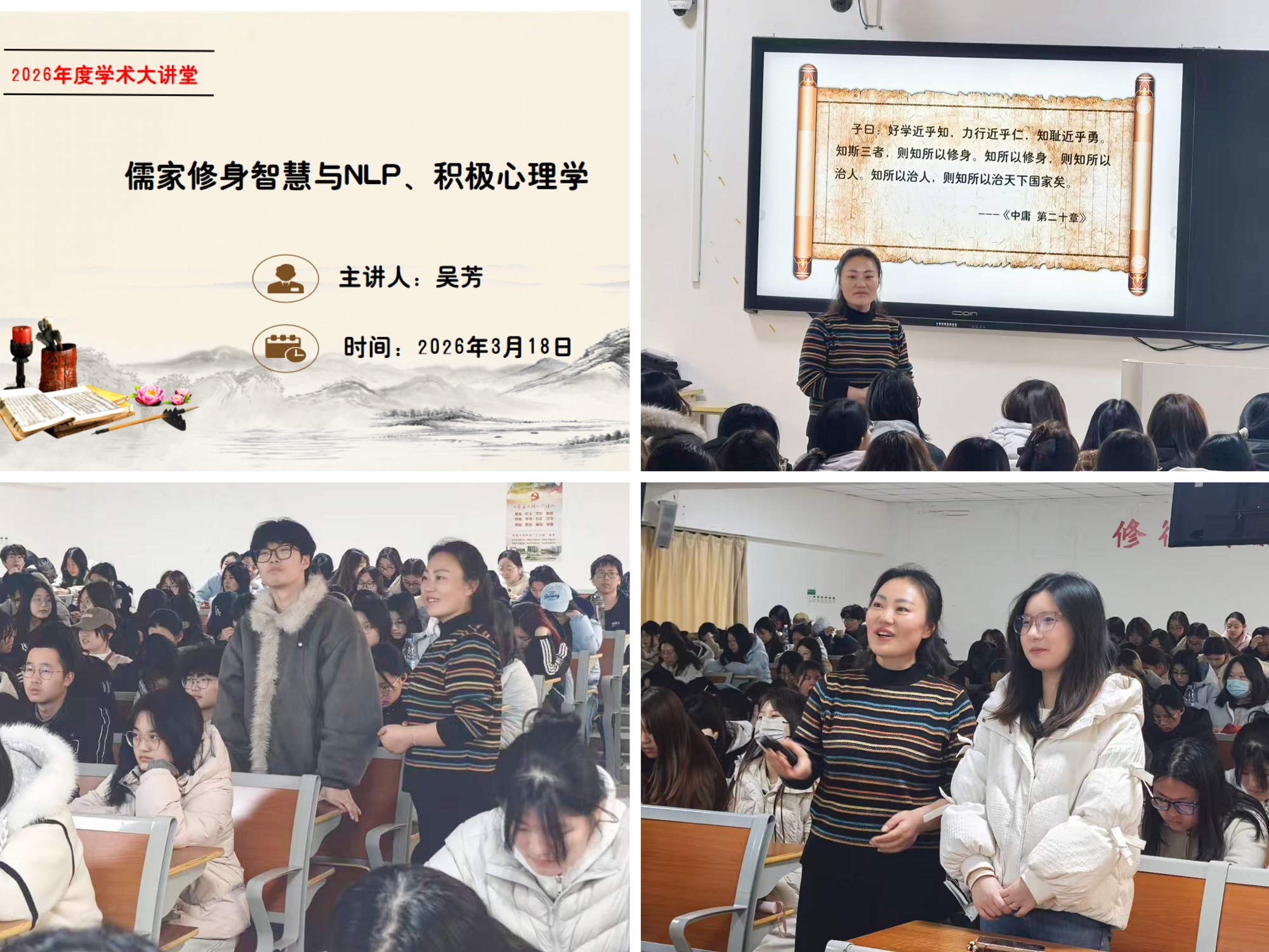 3月18日下午,文瀚楼201教室座无虚席,基础教学部大学语文教研室主任、国家二级心理咨询师吴芳以“儒家修身智慧与NLP、积极心理学”为主题,与金融学院200余名学子开展心灵对话。这是学校2026年度“学术大讲堂”系列活动之一。