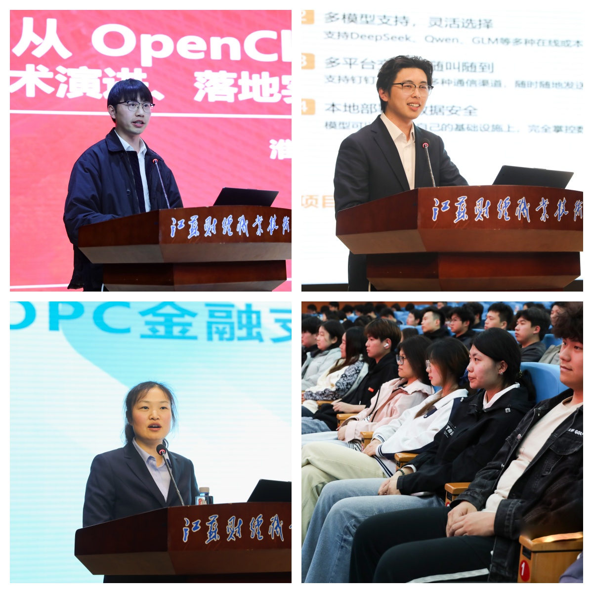 活动中,来自通信、金融领域的行业专家依次带来专题分享,内容兼具理论高度与实操价值。淮安联通创新业务中心主任李开放以《从OpenClaw看AI智能体:技术演进、落地实操与行业发展的理性复盘》为题,系统拆解AI智能体发展脉络,为师生打开OPC产业技术新视野。淮安电信集成与软研中心专家徐淮鑫以“如何养一只龙虾”的生动视角,开展OpenClaw部署与工具使用实战教学,手把手指导实操,让复杂技术易学易懂、易学易用。淮安农村商业银行信息科技部总经理王君围绕OPC金融支持产品详细解读,将金融服务与OPC产业场景紧密结合,呈现产业与金融融合的鲜活实践案例。