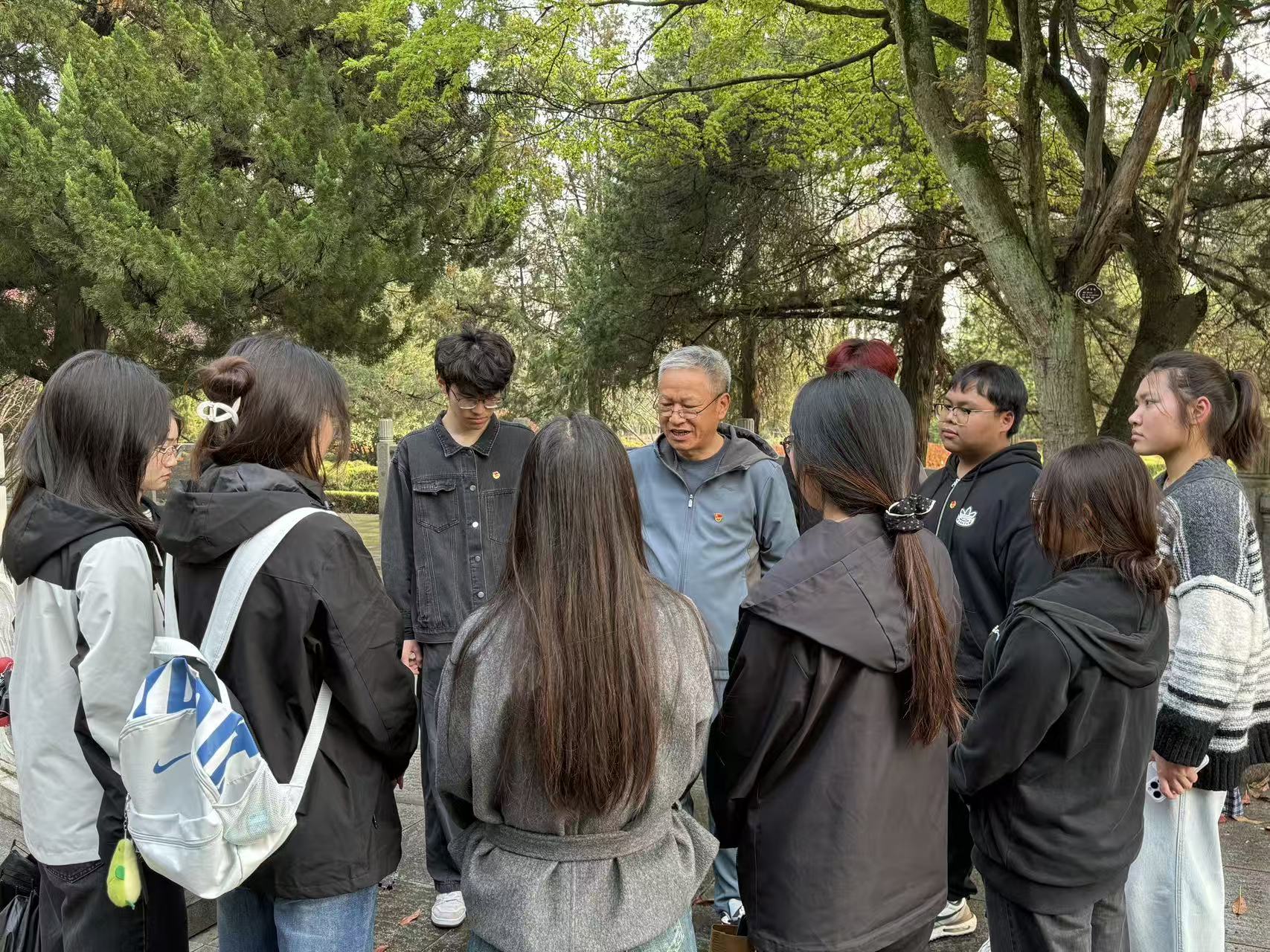 祭奠仪式结束后,全体师生有序参观八十二烈士纪念馆。在专业讲解员的带领下,大家近距离触摸历史脉络,深入了解烈士们的战斗历程与英雄故事。参观过程中,同学们自发围绕在关工委王立强老师身边,认真聆听他讲述那段烽火连天的亲身记忆与革命往事。王老师结合馆内展陈,深情回忆了刘老庄连八十二烈士浴血奋战的细节,勉励青年学子铭记历史、珍惜和平。学生们凝神倾听,不时提问交流,现场气氛庄重而热烈。这种“身边人讲身边事”的现场教学,让英雄精神更加可感可触,深深打动了每一位同学。活动最后,全体人员在八十二烈士纪念碑前合影留念,定格这份庄严与感动,留存珍贵的红色记忆。