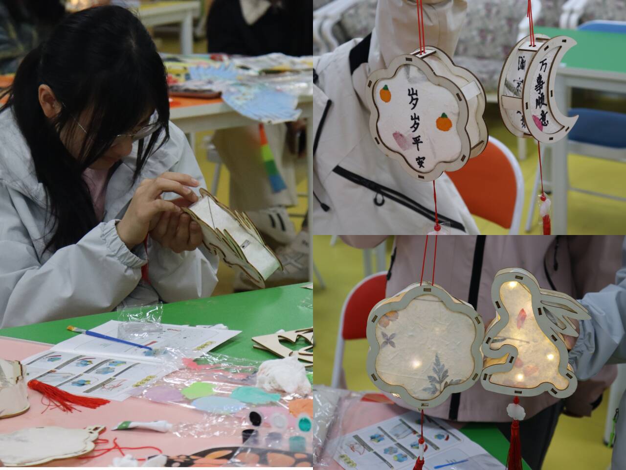 非遗花草灯制作环节尽显传统之美。在心理健康部同学的指导下,同学们使用木质灯框、花草纸、LED灯串等安全材料,细心完成粘帖、组装、装饰。一盏盏精致的花草灯次第点亮,暖柔光线与天然花草相映成趣,既展现了非遗手工的独特魅力,也为同学们点亮了内心的温暖与光亮。