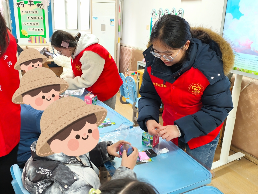 在“趣味拼图”环节,志愿者不做“指导者”,只做“玩伴”。他们陪着孩子慢慢拼接,不催促、多鼓励,用掌声和称赞给予孩子安全感。随后的“黏土地球仪DIY”中,志愿者协助固定造型,鼓励孩子们大胆创作。看着孩子们专注的眼神和完成作品后的笑容,志愿者们深刻体会到:对特殊儿童而言,最好的礼物不是昂贵的玩具,而是有人愿意停下脚步,放下浮躁,认真陪伴。