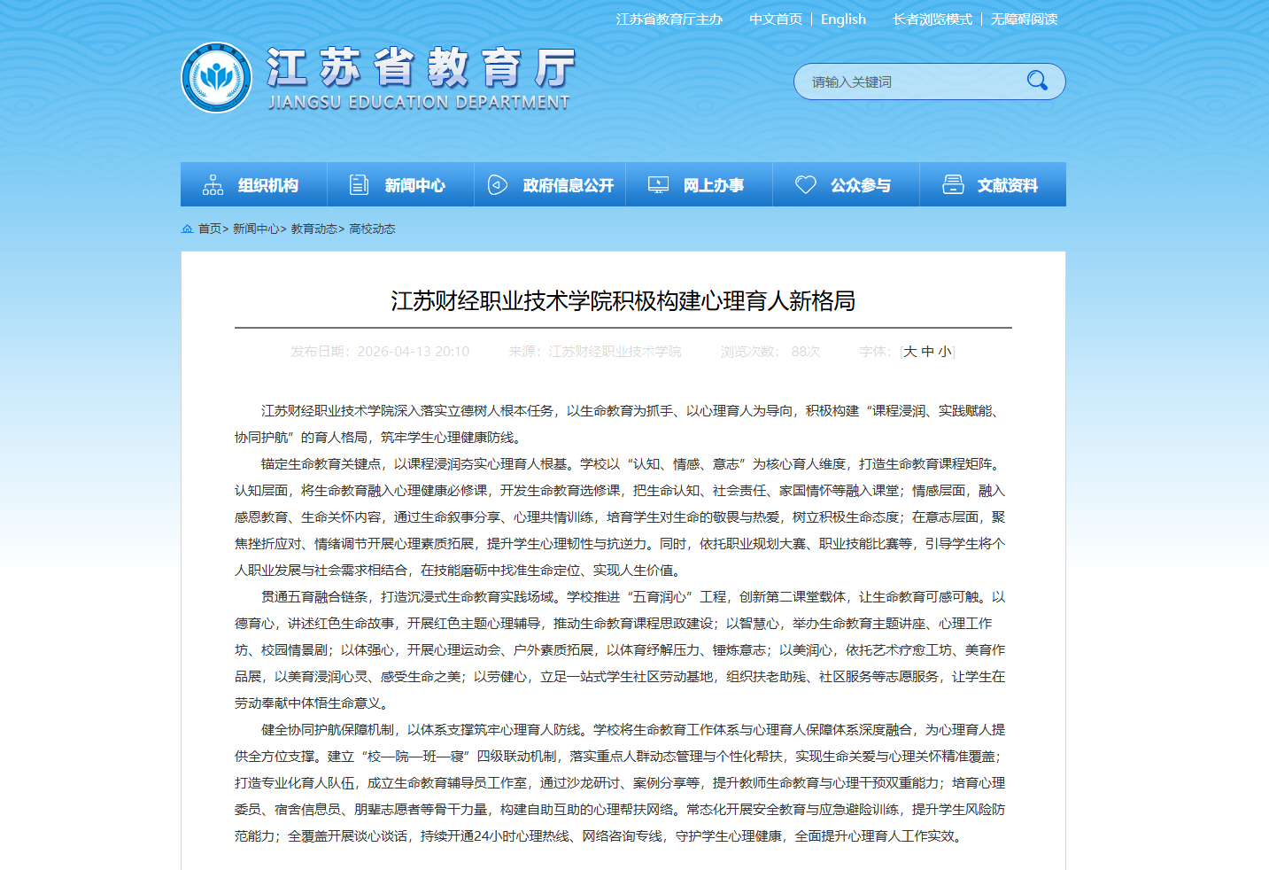 江苏财经职业技术学院深入落实立德树人根本任务,以生命教育为抓手、以心理育人为导向,积极构建“课程浸润、实践赋能、协同护航”的育人格局,筑牢学生心理健康防线。