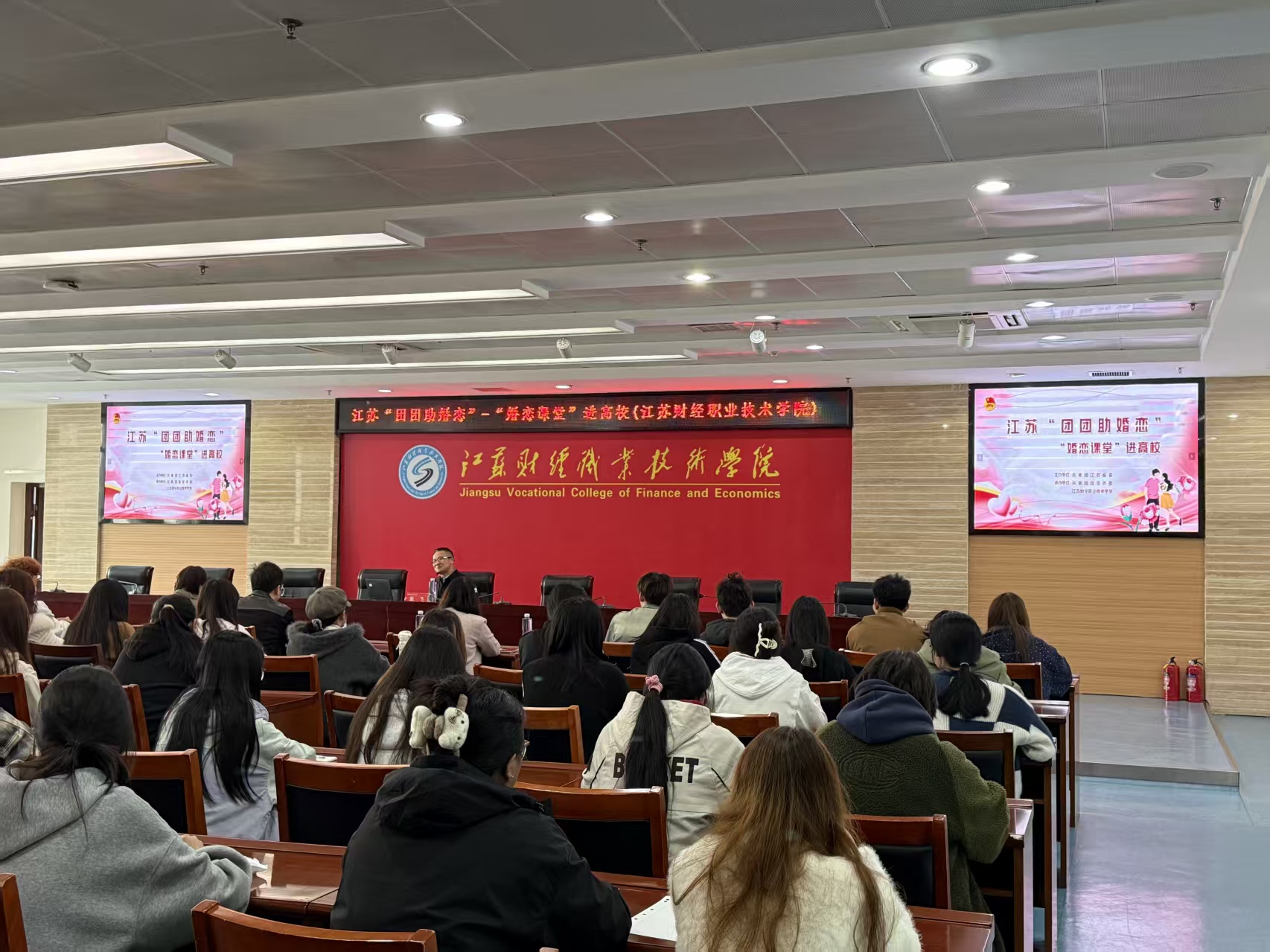 4月3日上午,由共青团江苏省委主办,共青团淮安市委、江苏财经职业技术学院联合承办的 “团团助婚恋” 婚恋课堂进高校专题讲座在我举行。本次讲座特别邀请殷飞教授担任主讲嘉宾,吸引了近百名在校学子齐聚现场,共同参与这场兼具实用性和温度的情感成长分享会。
